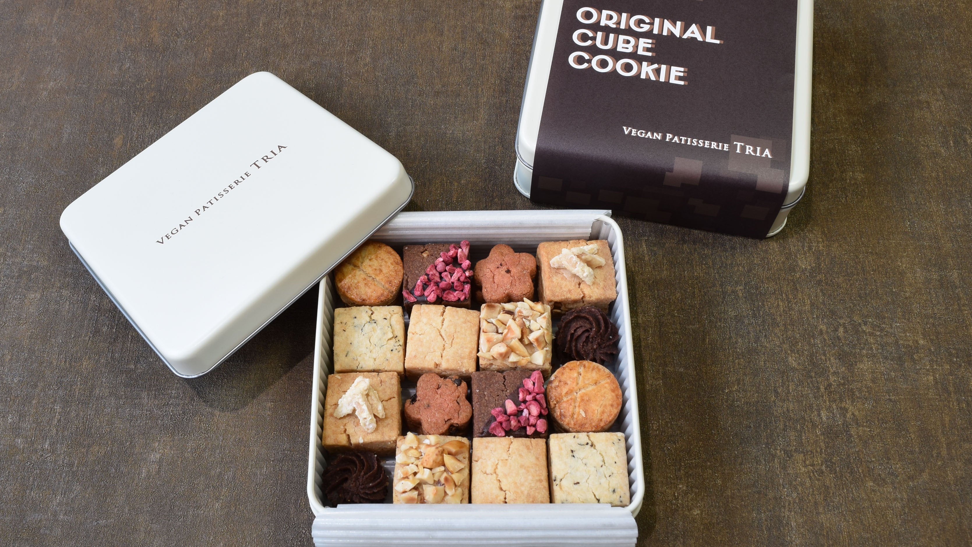 ヴィーガン&グルテンフリースイーツ専門店VEGAN PATISSERIE TRIA(ヴィーガンパティスリートリア)で人気のキューブクッキーをバージョンアップし、クッキー缶に詰めさらにニューフレーバーも追加して詰め合わせました。