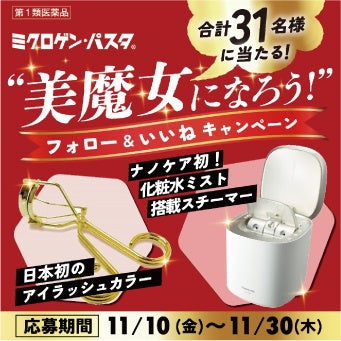 啓芳堂製薬では、Instagramでミクロゲン・パスタ公式アカウントを開設し、ストリートスナップで撮影した”街ゆくすてきな女性”をご紹介しています。この度、「いつまでも美しいジブン」を追求する皆様を応援するために、Instagram公式アカウント(@microgen_pastae https://www.instagram.com/microgen_pastae/)をフォロー、いいねをしていただいた方に、抽選でPanasonicナノケアスチーマー(1名様)、啓芳堂製薬復刻版アイラッシュカーラー「ビウラ」(30名様)をプレゼントいたします。