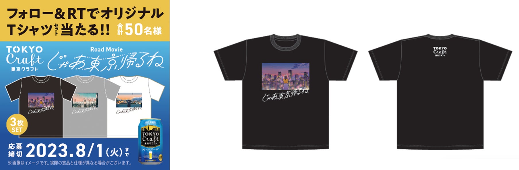 サントリー公式Twitterアカウント(@suntory)をフォローし、キャンペーンツイートをリツイートした⽅から抽選で50名様にオリジナルデザイン「じゃあ東京帰るね」Tシャツをプレゼント。