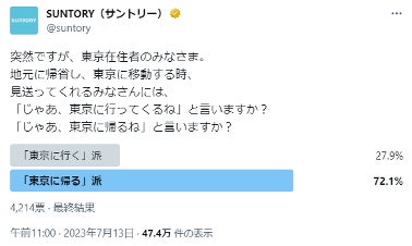 「東京に⾏く」派27.9%、「東京に帰る」派72.1%と