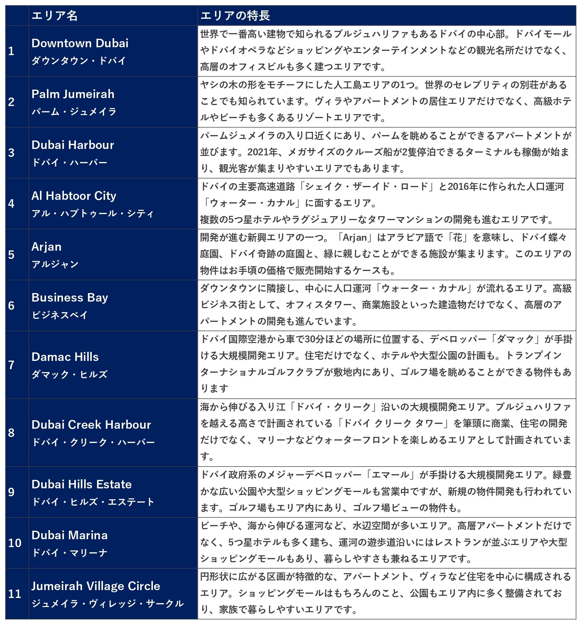 ■ドバイ不動産の注目11エリアを厳選!平均単価や利回り、価格変動率などをわかりやすく紹介する「ドバイ不動産注目エリアMAP」