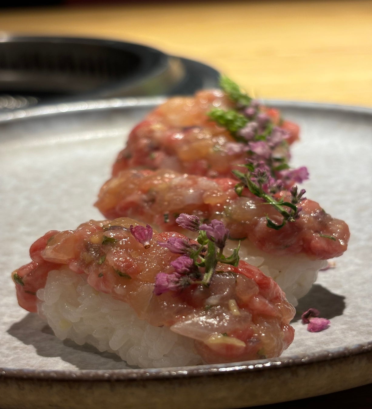 海外にも人気な寿司を牛肉でも。日本の伝統的な魚料理のなめろうを和牛と組み合わせ、それをお寿司に仕上げております。