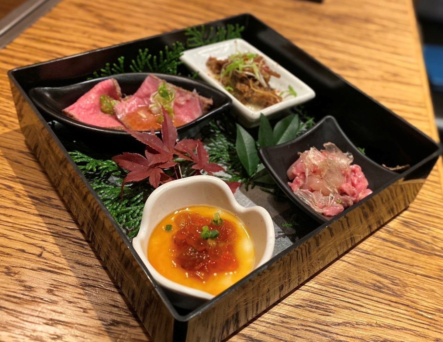 前菜は牛を使用した和食の重箱をイメージ。魚介と組み合わせた“なめろう”や牛出汁の茶碗蒸しなど、時期に合わせ内容は変わります。