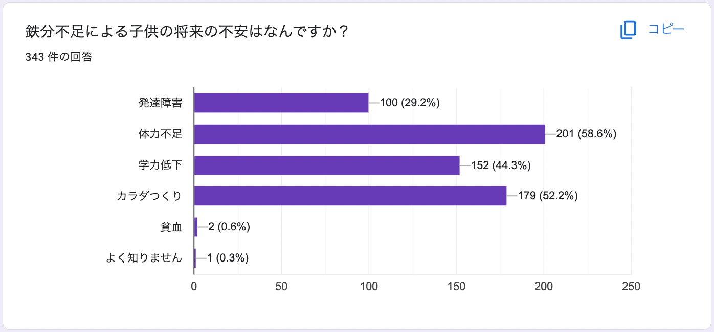 また鉄分不足による子供の将来の不安については「体力不足」が58.6%と最も多く、「カラダ作り」が52.2%と次に多い結果となりました。