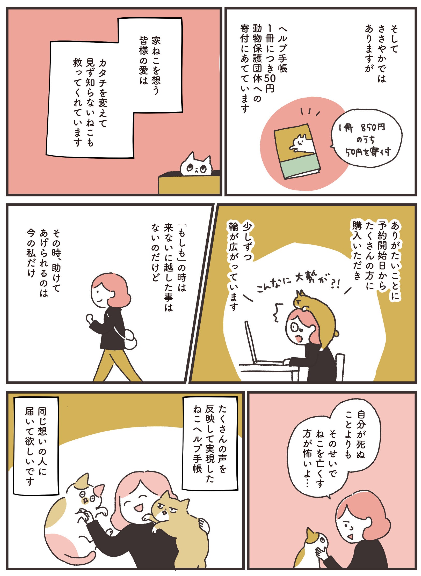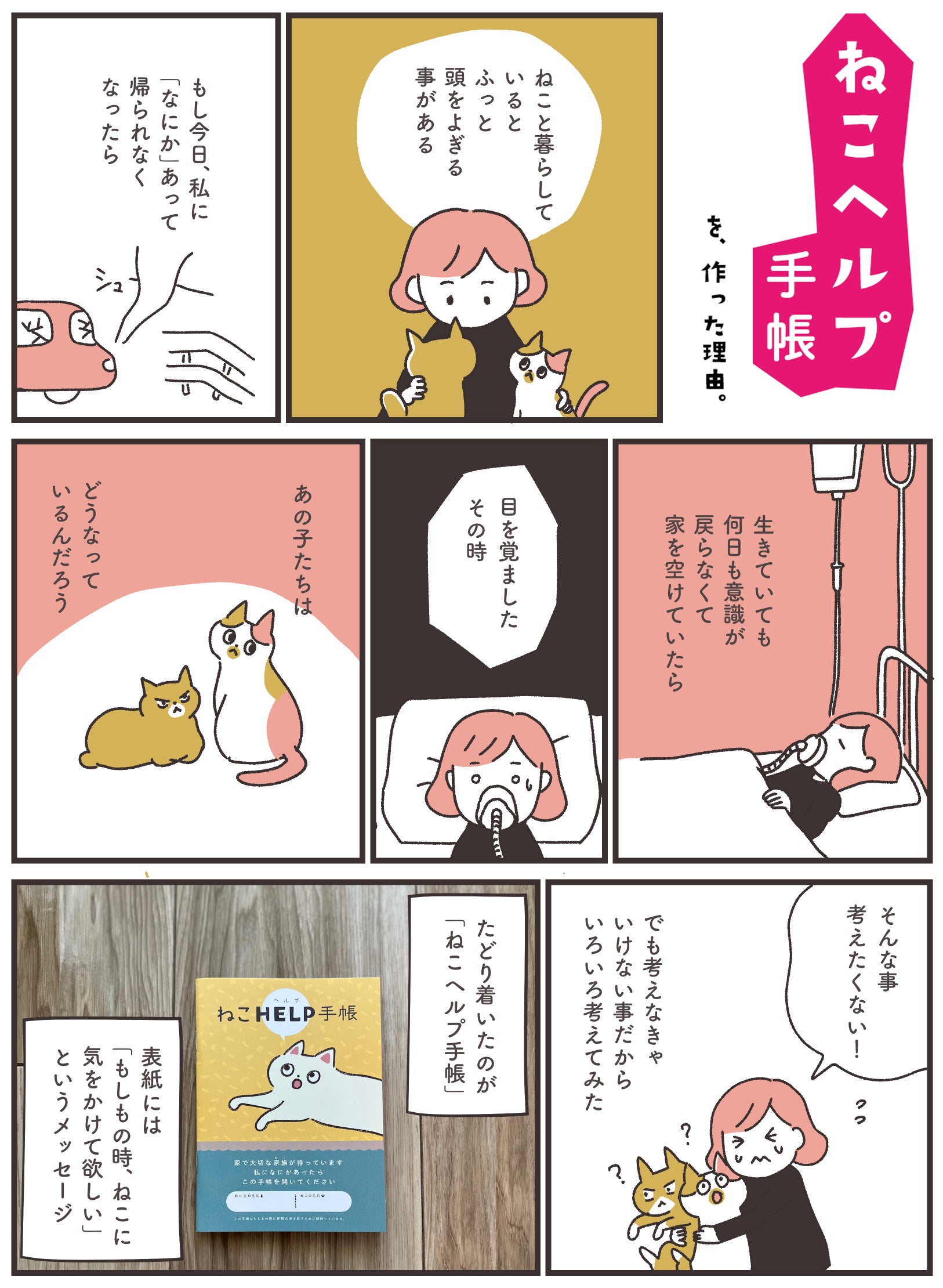 「猫を残して死ねない問題」をライフワークとし、「ねこヘルプ手帳」「どうぶつヘルプカード」などを考案・製作している。