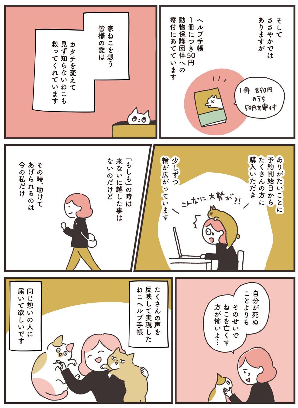 ねこヘルプ手帳はオキエイコ個人の制作物として製作販売されたましたが、その必要性を記した漫画と共に自身のTwitterで呼びかけると、販売開始前にかかわらず問い合わせが殺到。予約期間の間に1000件以上の予約が入り、発売前完売となりました。2022年7月に発売以来、1年で4000部以上を売り上げています。