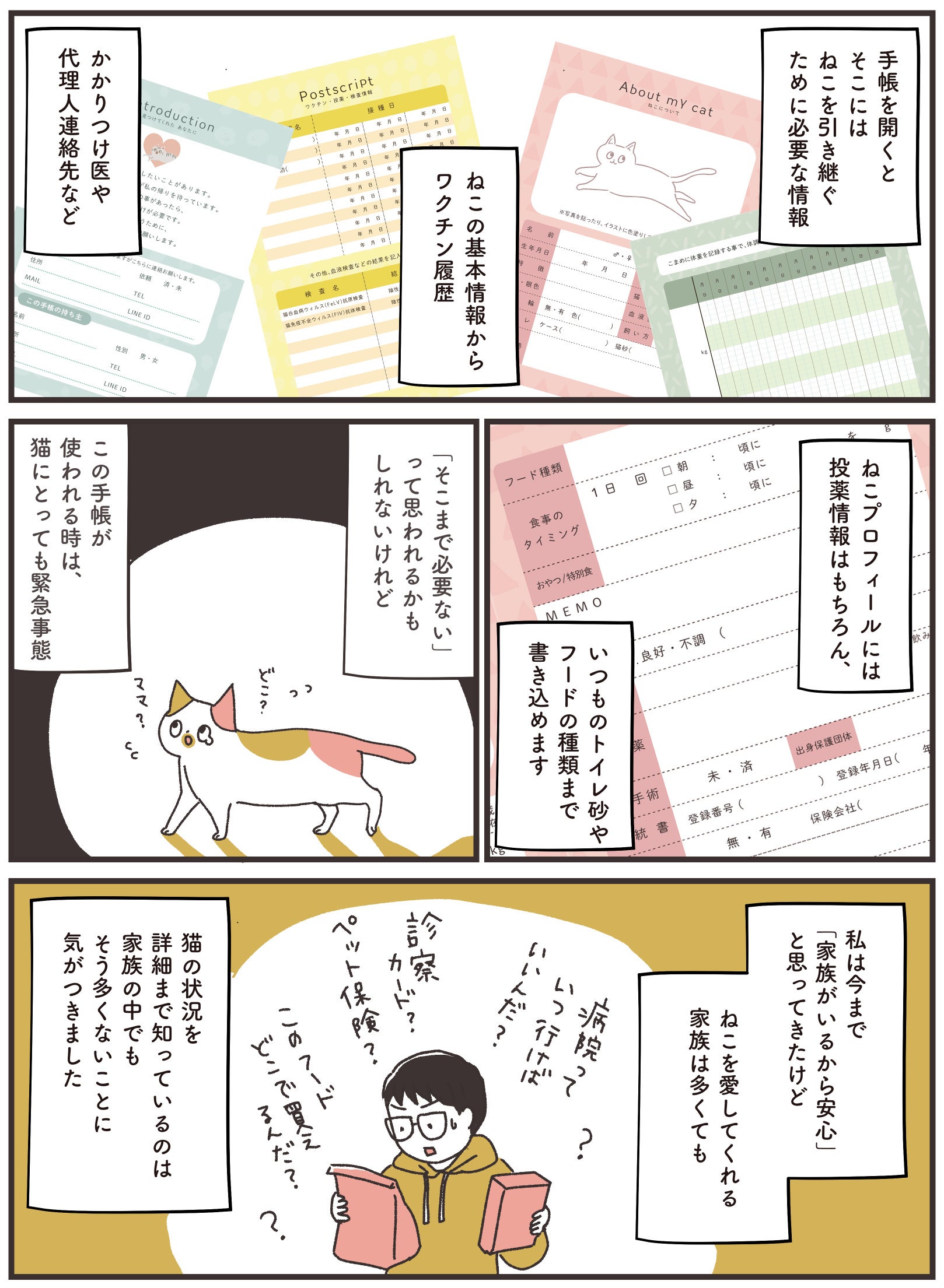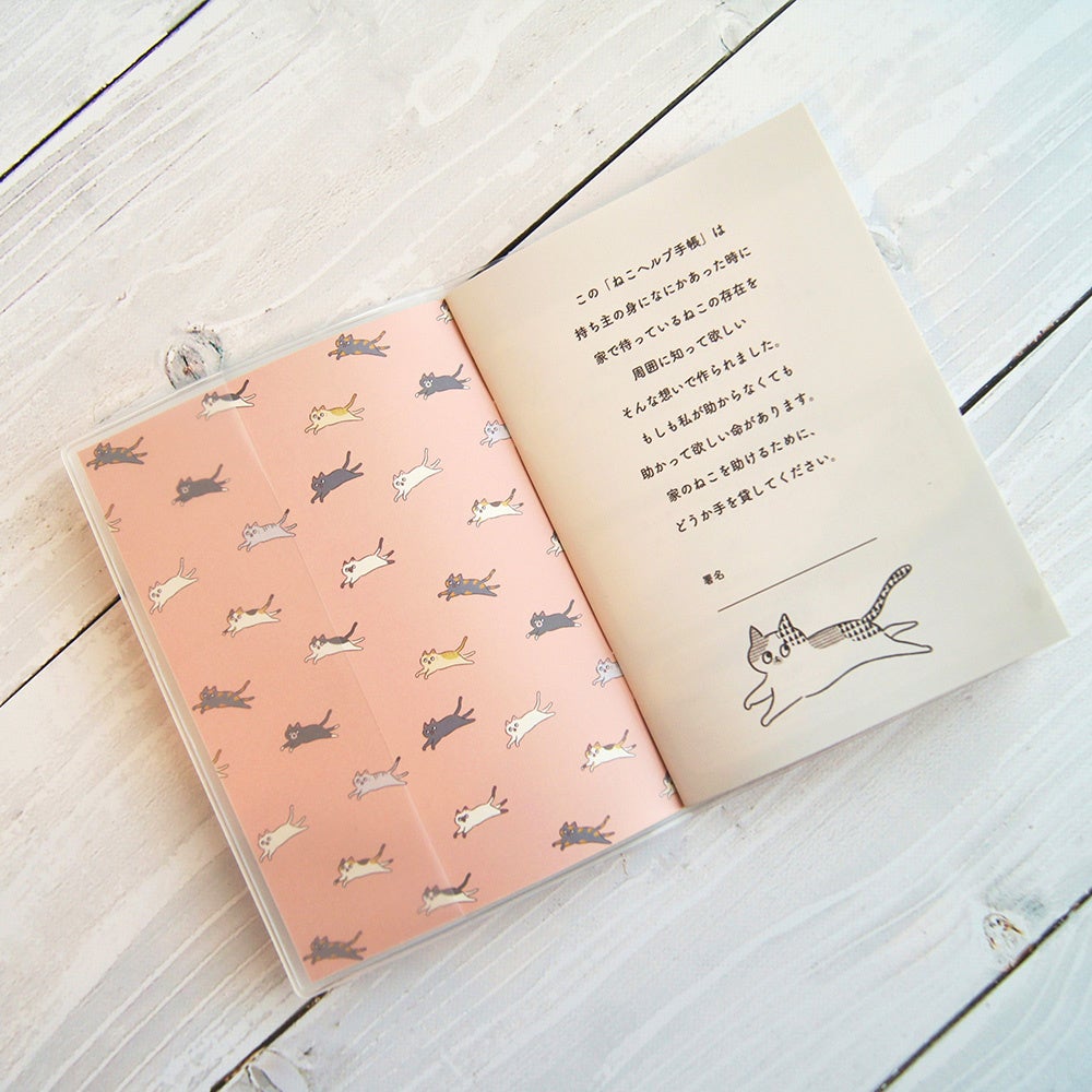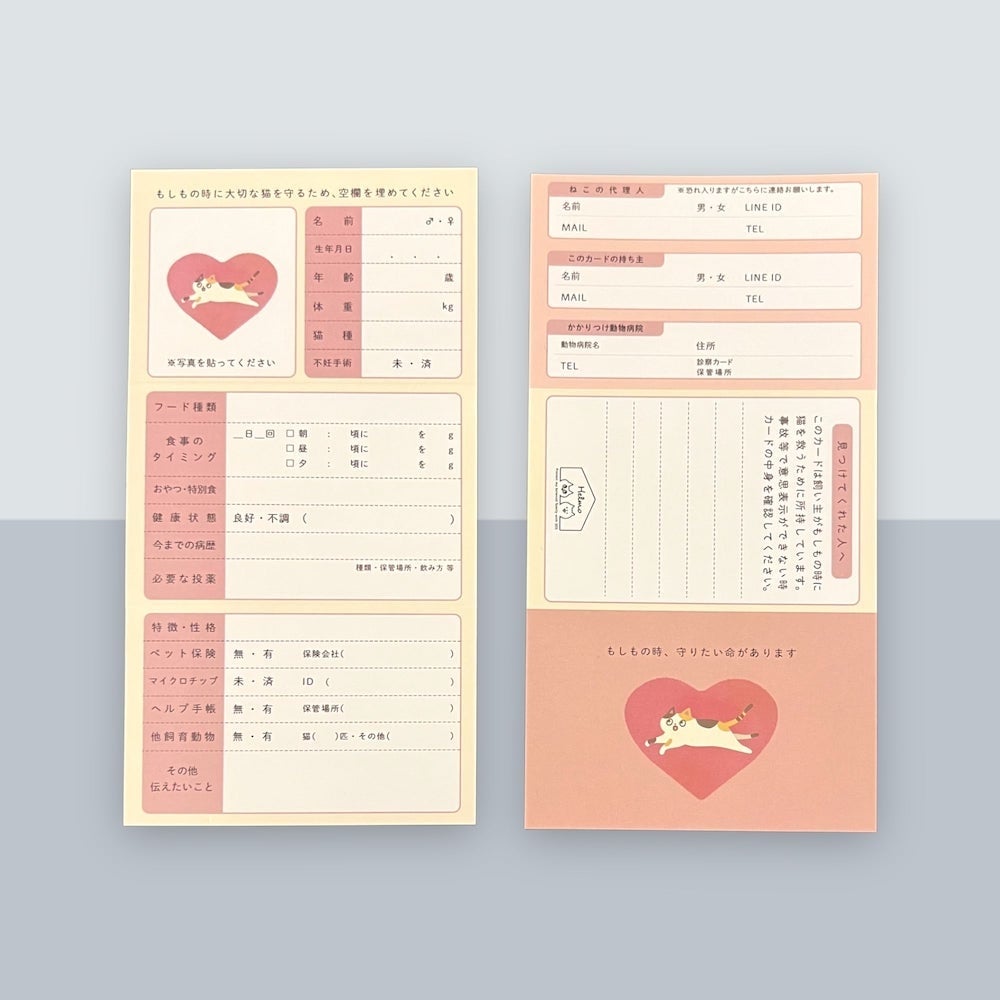 緊急時に周囲に家猫の存在を知らせるための表紙と、代理人の連絡先やかかりつけ病院の連絡先など、必要な情報がまとめられた手帳。
