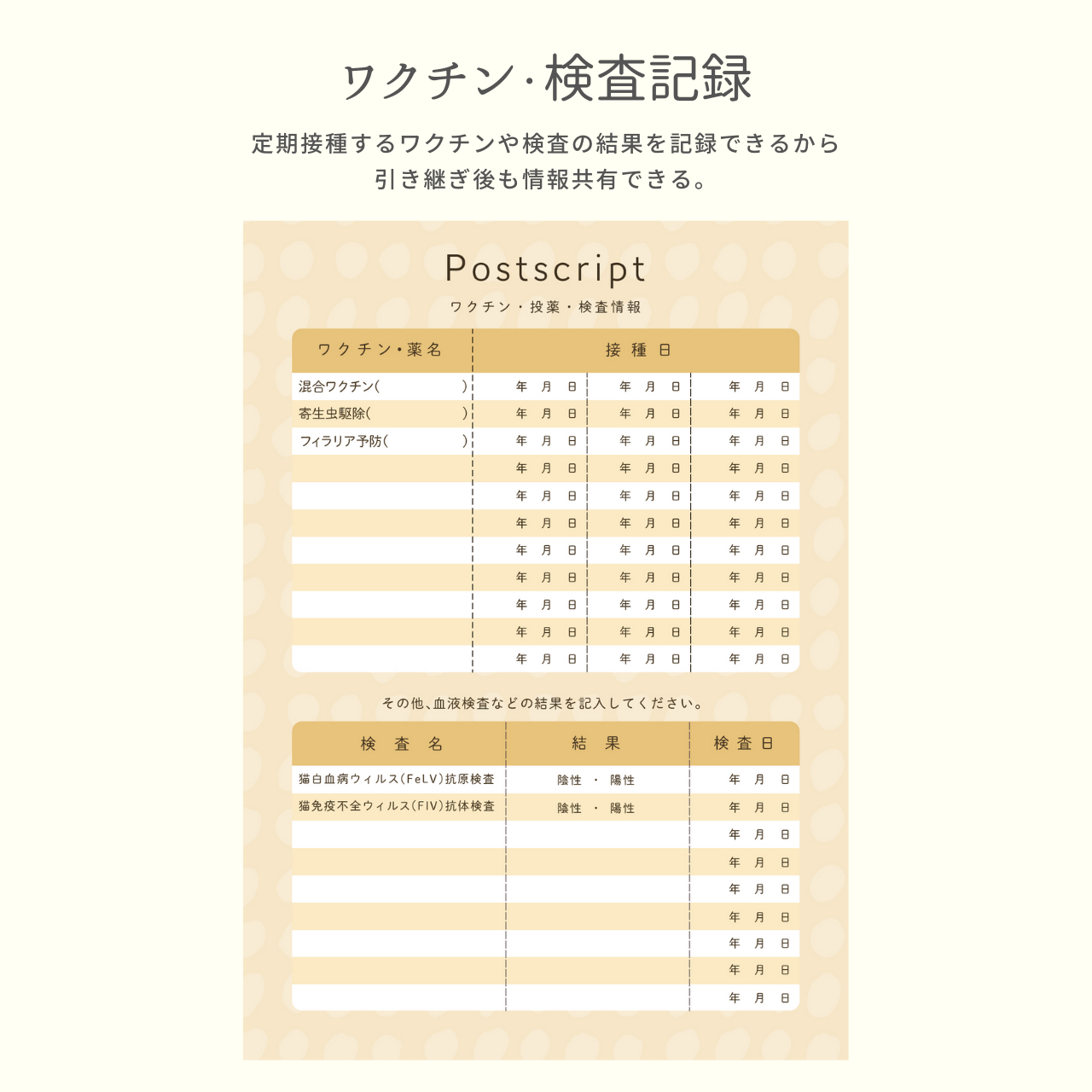 さらに猫のワクチン情報やアレルギー情報、食事やトイレについての注意事項など、家猫についての情報が全て網羅できる。まさに猫の母子手帳と言われる一冊。