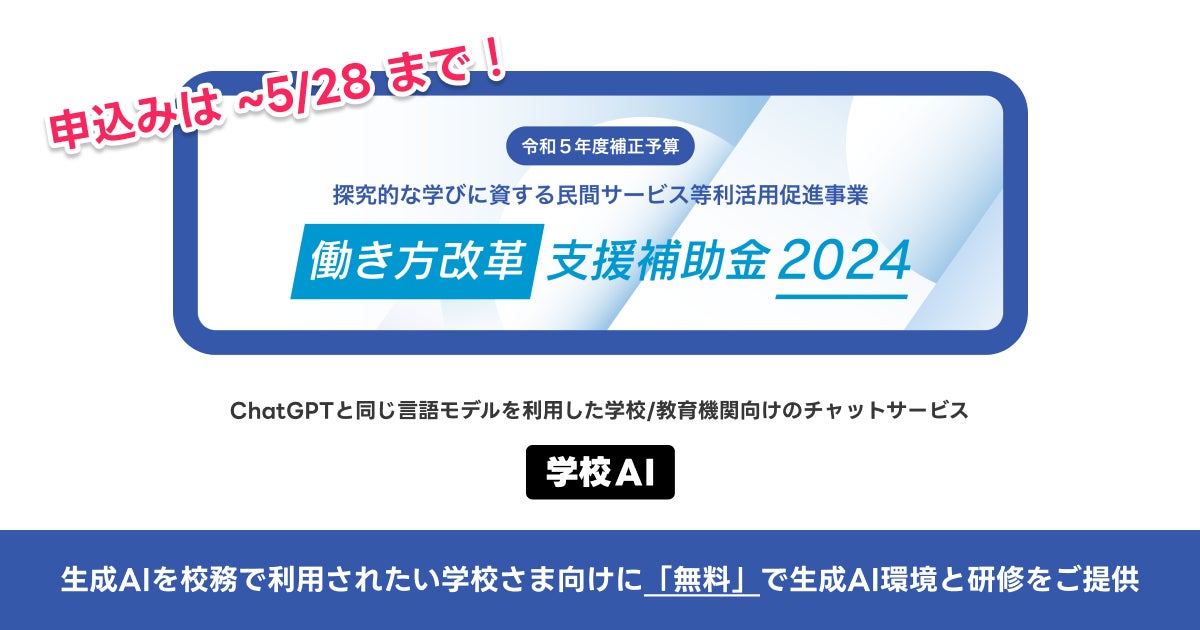 情報セキュリティに対応した教育機関向けプライベート生成AIクラウド「学校AI」、経産省「働き方改革支援補助金2024」に採択。すべての学校に「学校AI」と生成AI研修を無償提供。