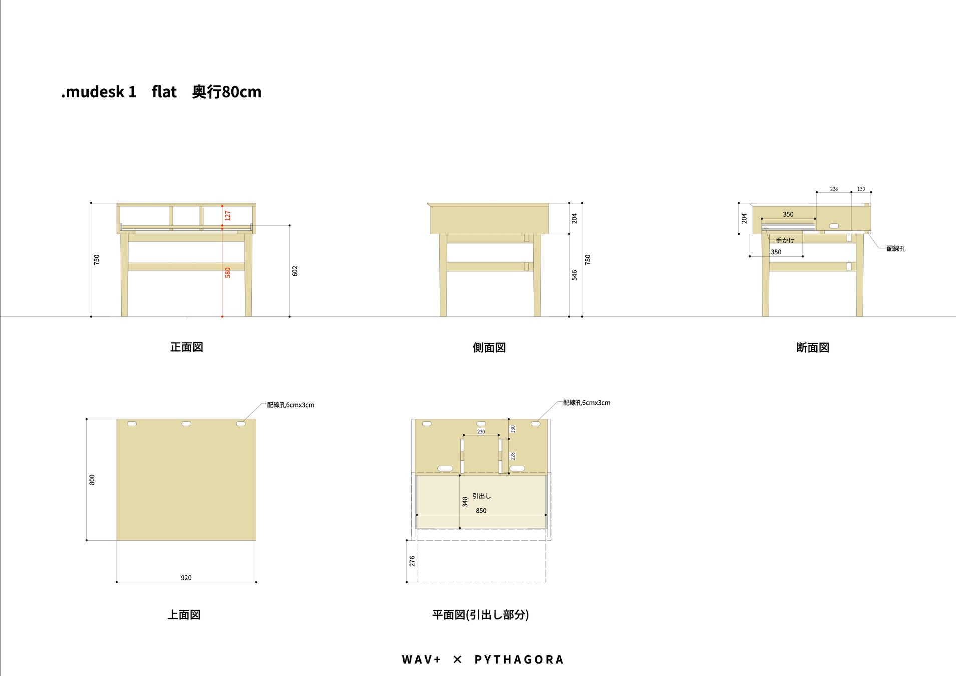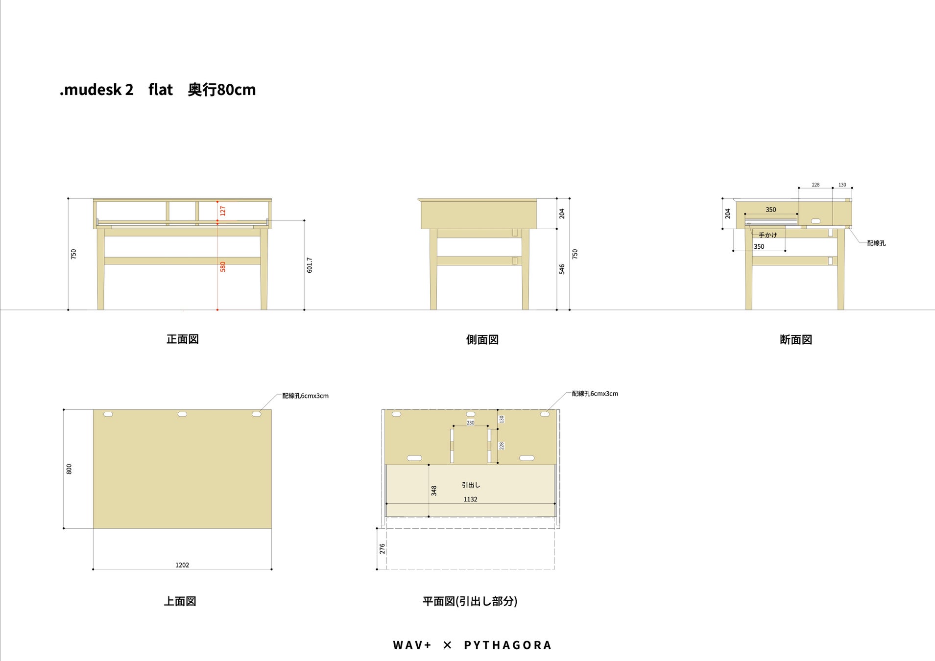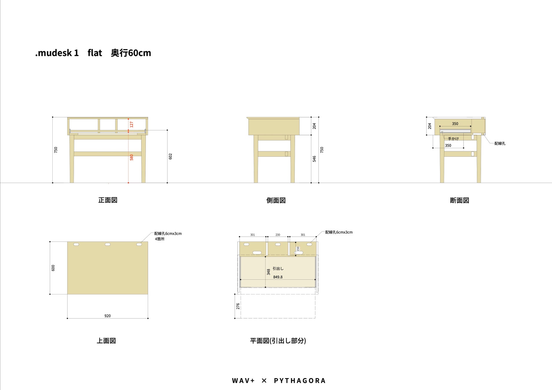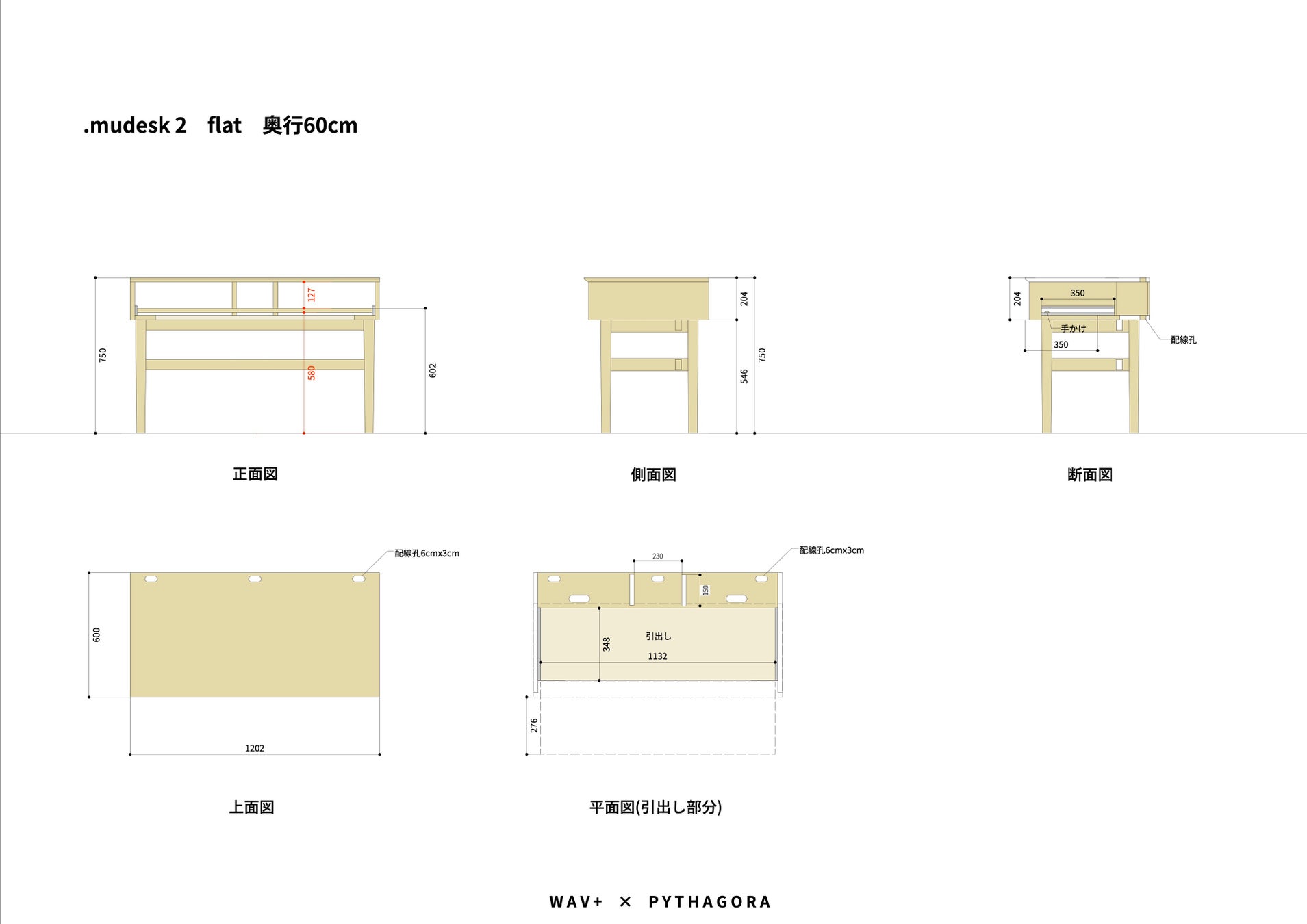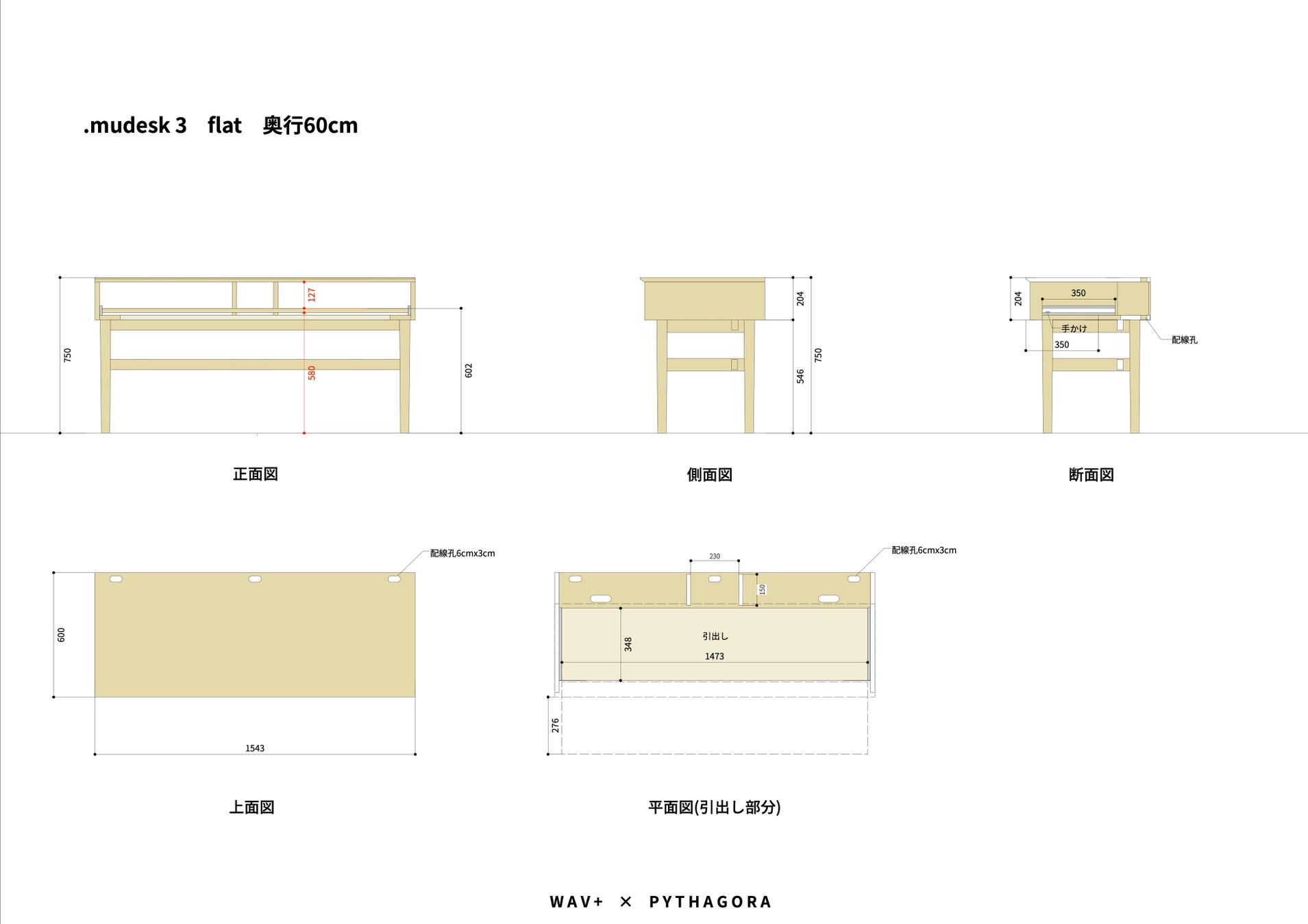 従来の.mudesk 1 =W92cm、.mudesk 2 =W120cm、.mudesk 3 =W154cmの3つのワイドパターンに加えて、奥行き違いでD60cm・D80cmの2タイプをご用意。