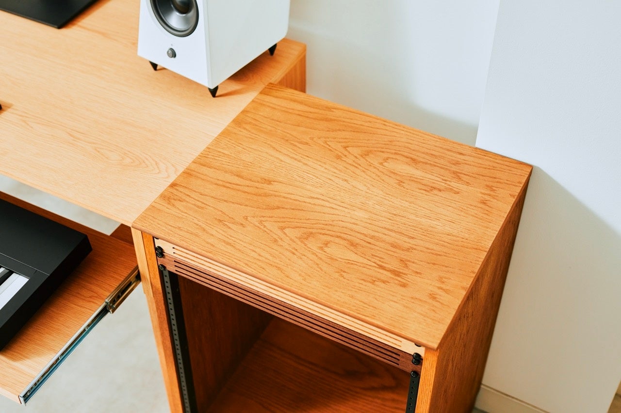 .murack一台につき14U 分のアウトボード収納スペースを確保することができ、また天板を広げるという点でも一役買うことが可能です。