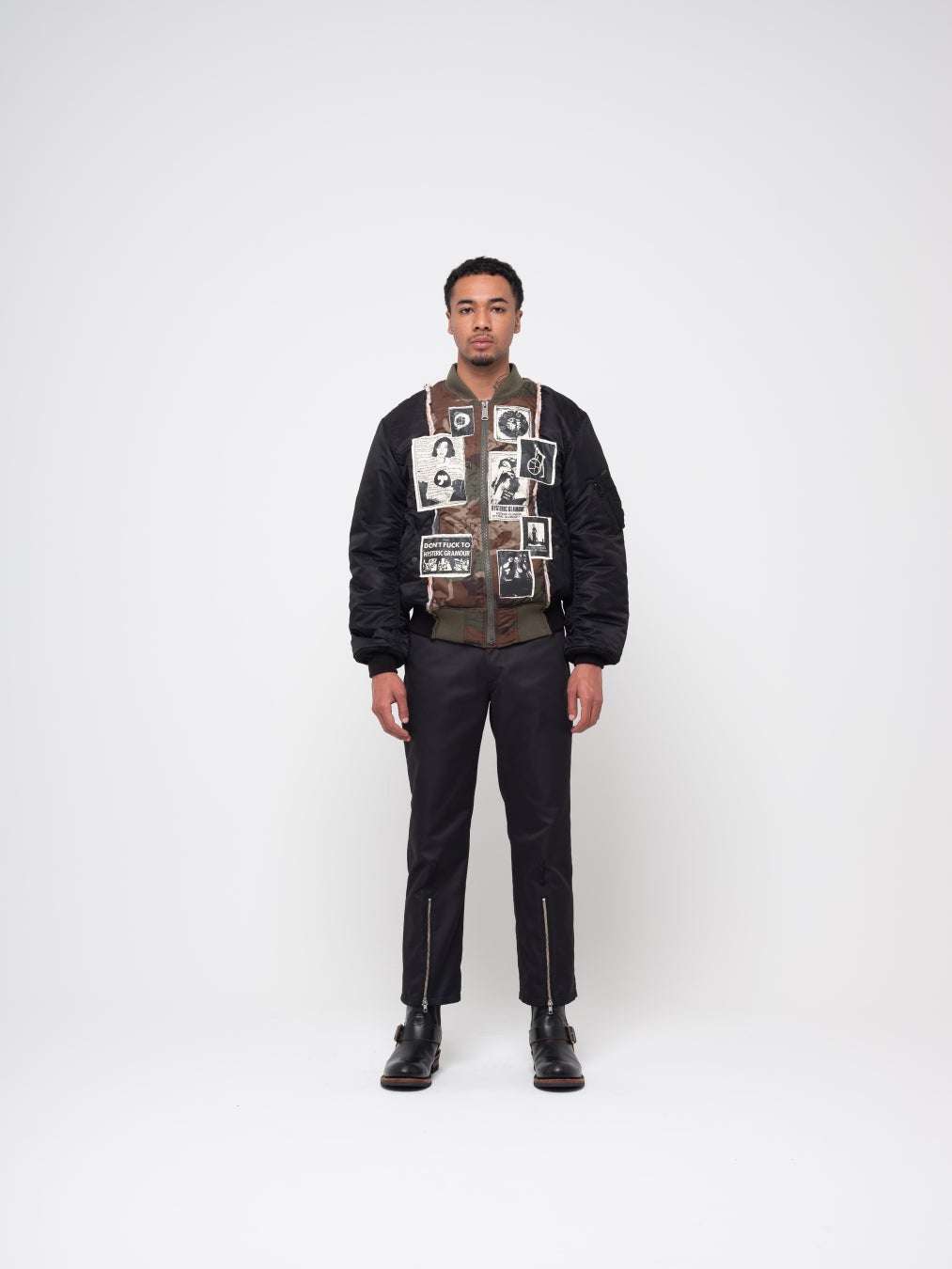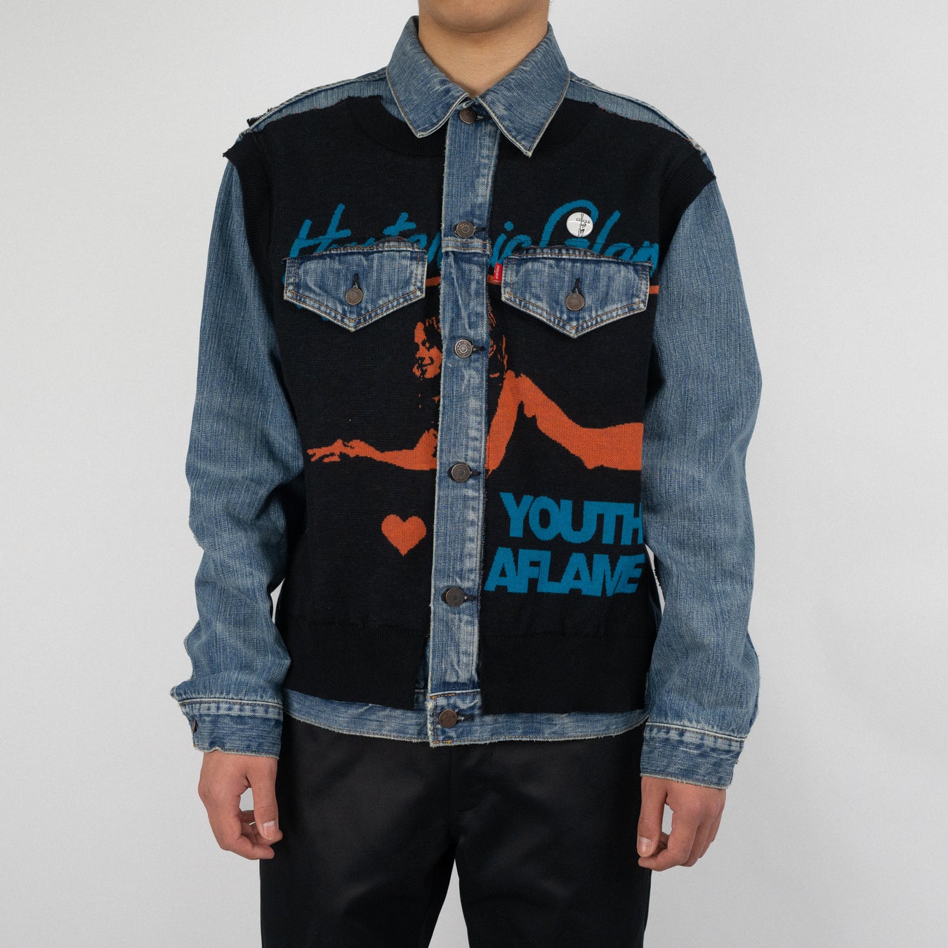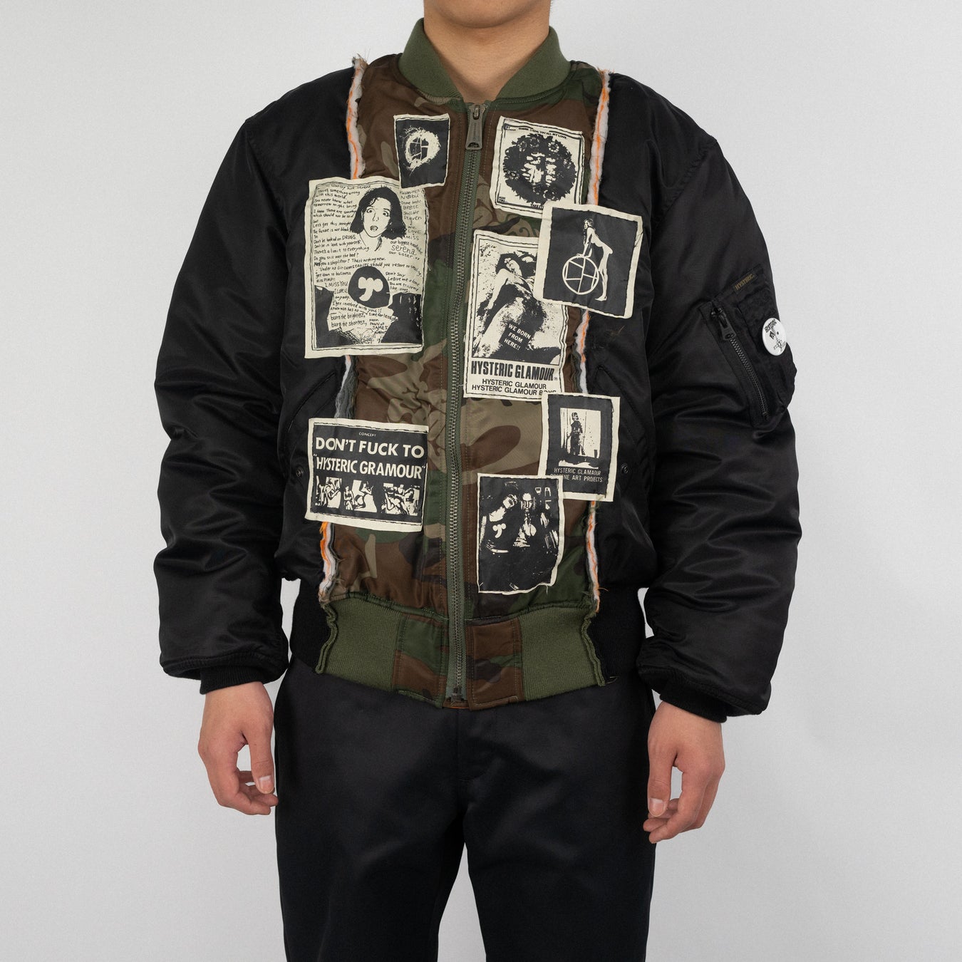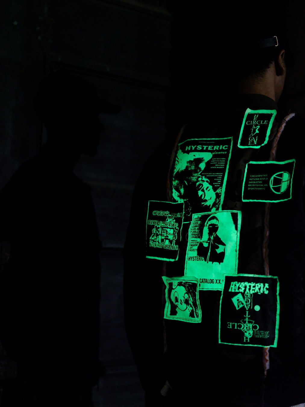 HYSTERIC GLAMOURの代表的なアイテムである通称“ウミヘビデニム”やMA-1、3rd型のデニムブルゾンなどを使用し、大胆にリメイクした一点物のアイテムや、大変貴重なHYSTERIC GLAMOURの80年代からのアーカイブ資料から掘り起こしたグラフィックをコラージュした(全て蓄光プリント)ブランドオリジナルフーディ、そして北村氏自ら今回のコラボレーションのために書き起こしたオリジナルロゴなどを使用した3型のティーシャツ、2型のバッジセットを展開。