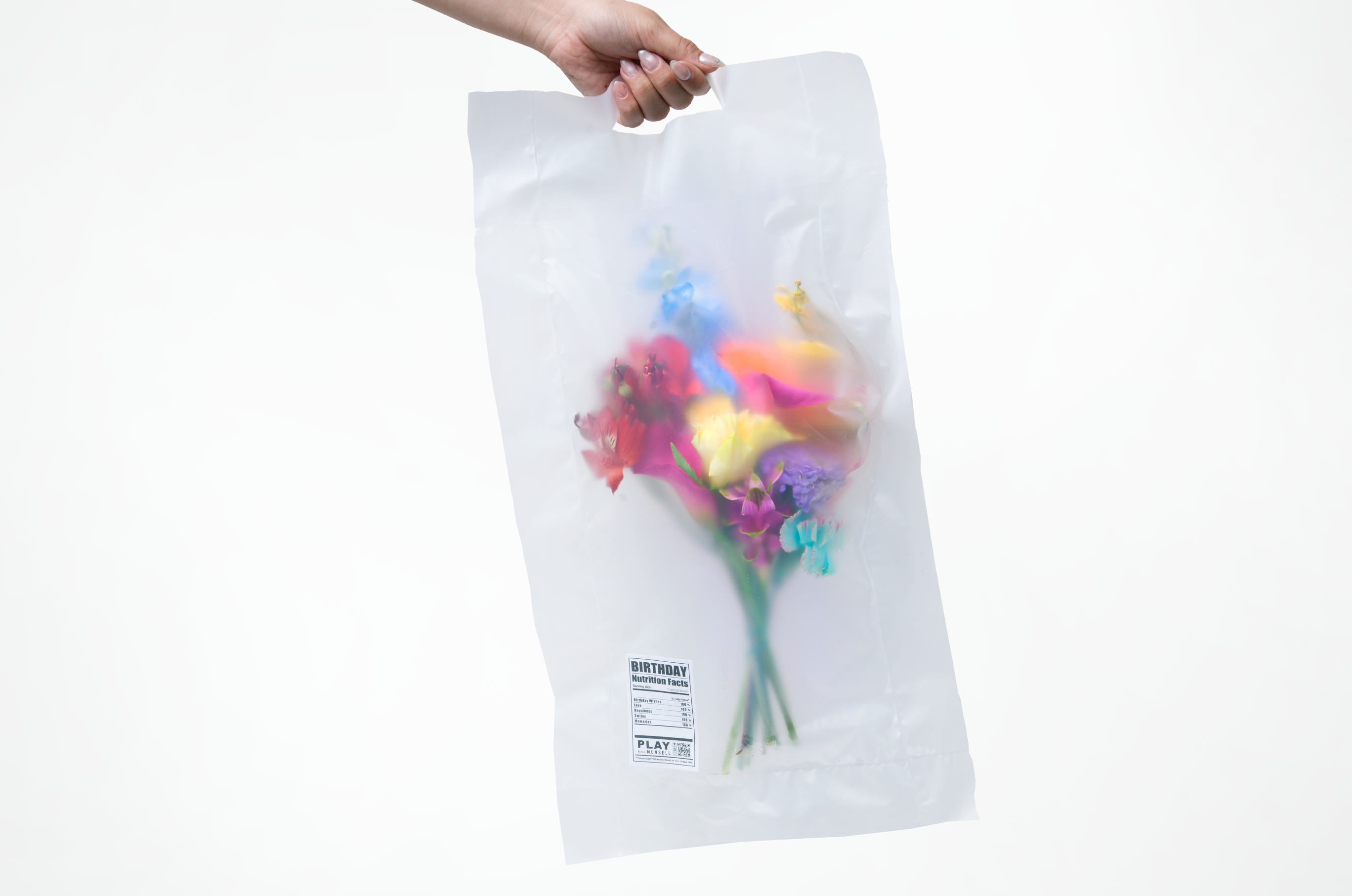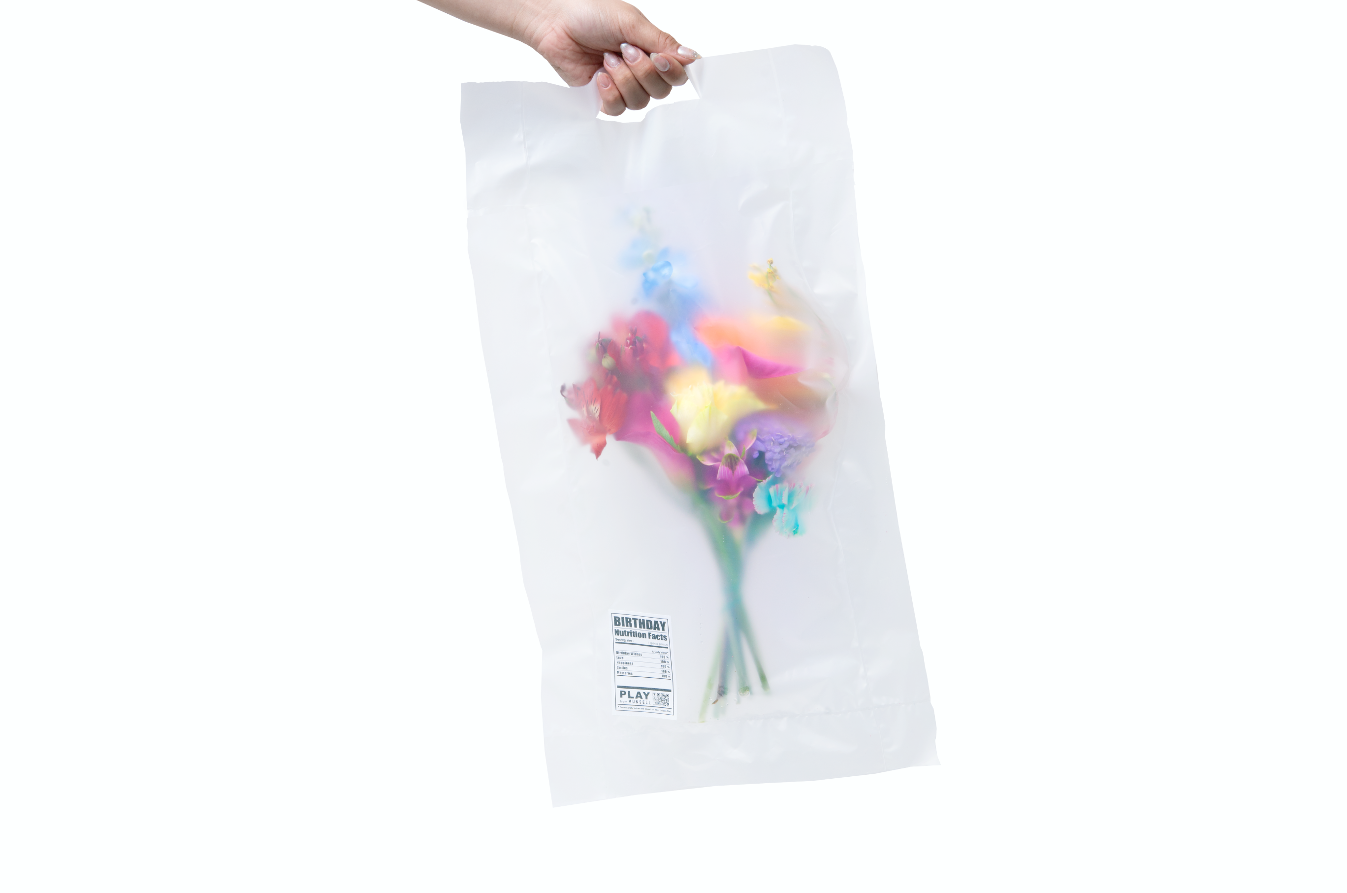 透け感のある素材でパッキングをすることで包装の役割を果たしながらも“なんのお花が入っているか”を隠すようにデザインを施しました。