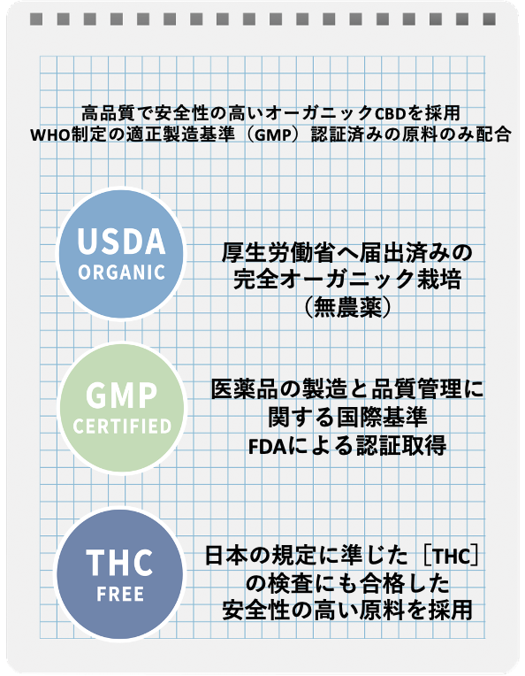 CBD(カンナビジオール)は、植物の麻(ヘンプ)の茎や種子から採取される貴重な成分で、精神作用や中毒性がなく、自律神経を整え、イライラやストレスの緩和が期待できると言われています。
