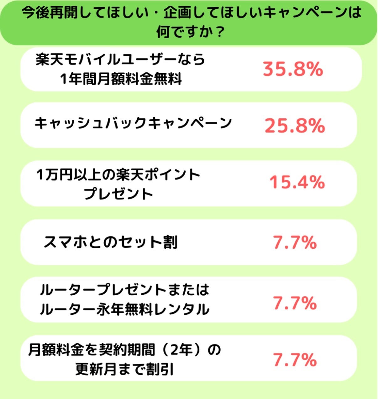 今後再開してほしい・企画してほしいキャンペーンでも「楽天モバイルユーザーなら1年間月額料金が無料」が選ばれました。