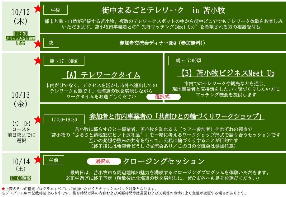 期間中の指定プログラム(下図)に参加しながら、リモートでのお仕事を苫小牧市内およびその近郊で行うことのできる社会人の方