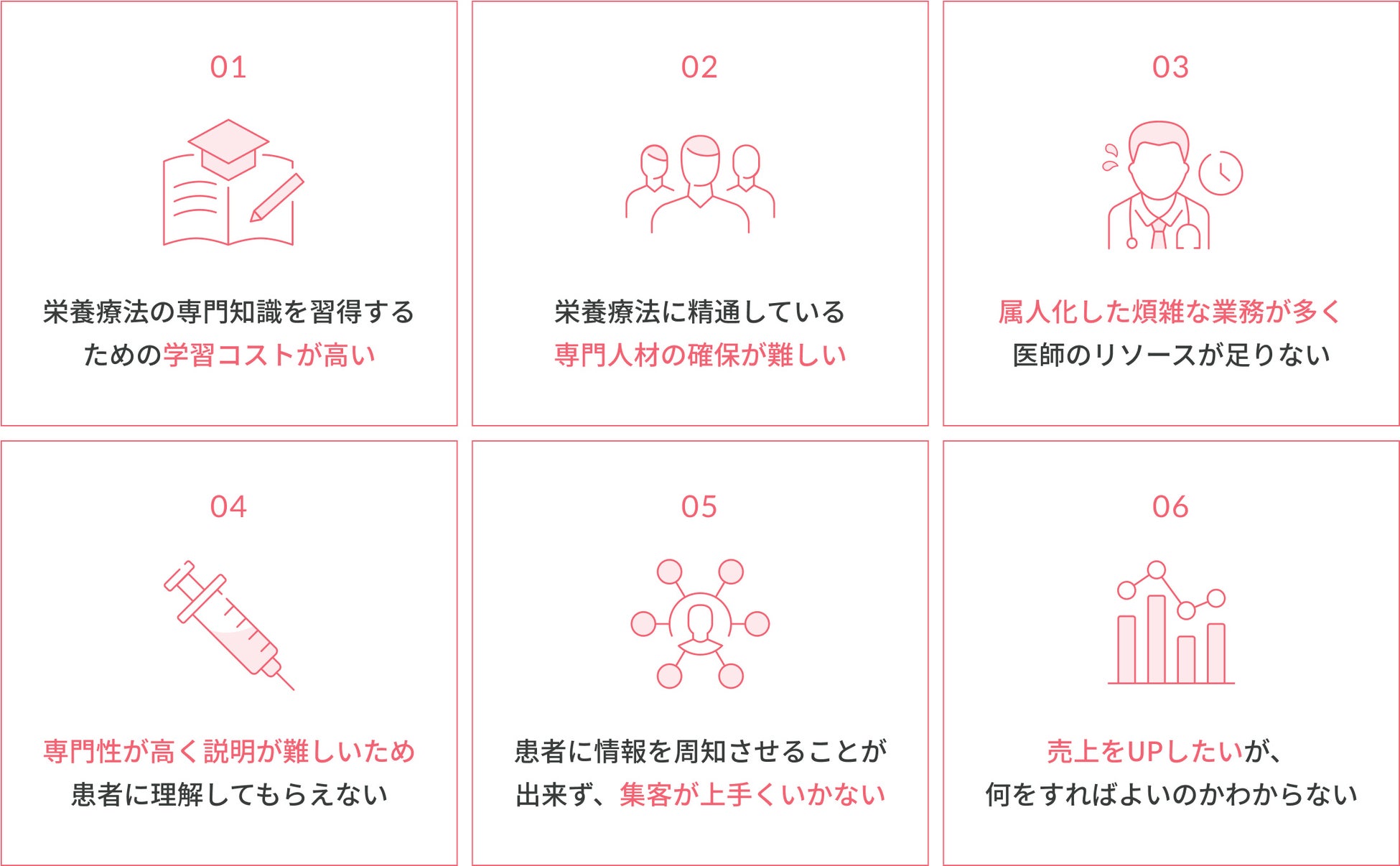 病の根本原因にアプローチする栄養療法やバイオロジカル検査を取り扱うクリニックでは、以下のような課題があり、続けることができない or なかなかスタートすることができない現状があります。