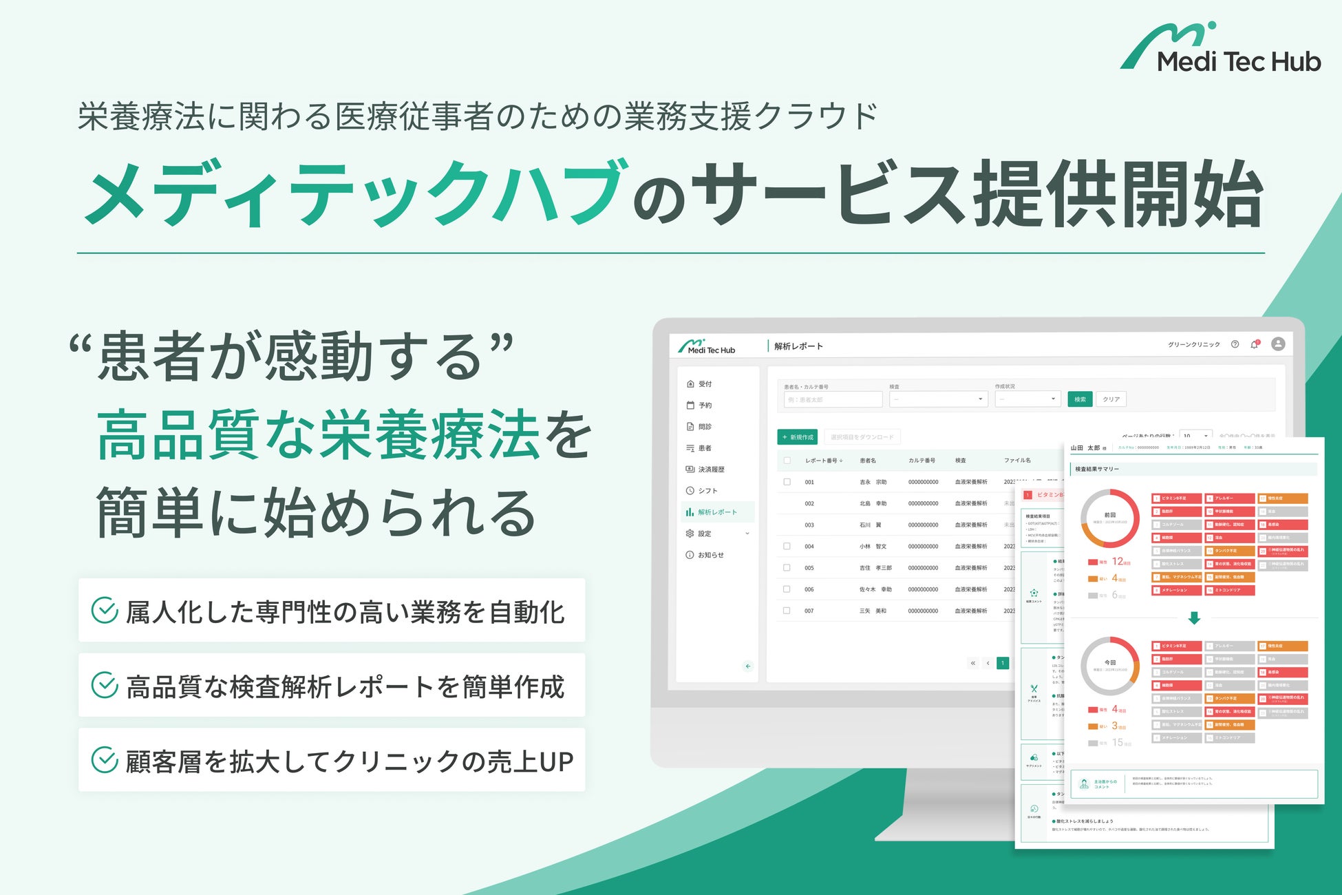 株式会社グリーンメチル(本社:埼玉県さいたま市大宮区桜木町1-378、代表取締役:小林良太、以下「グリーンメチル」)は、栄養療法に関わる医療従事者のための業務支援クラウド「メディテックハブ」を2024年3月4日より正式にサービス提供開始することをお知らせいたします。
