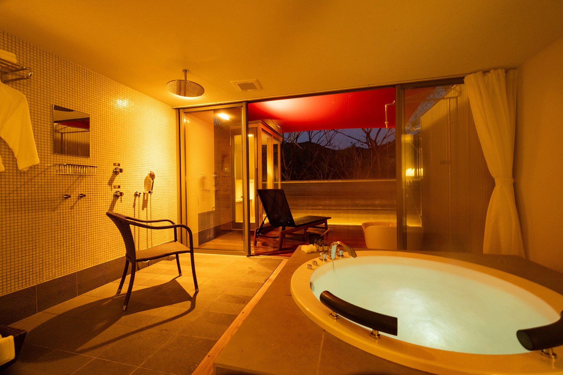 主な特徴としては全室に客室専用ジェットバス付き露天風呂(半露天風呂)とロウリュ式プライベートサウナルームを設け、人目を気にせず滞在中は何度でも露天風呂(半露天風呂)とサウナが楽しめる仕様となっており、