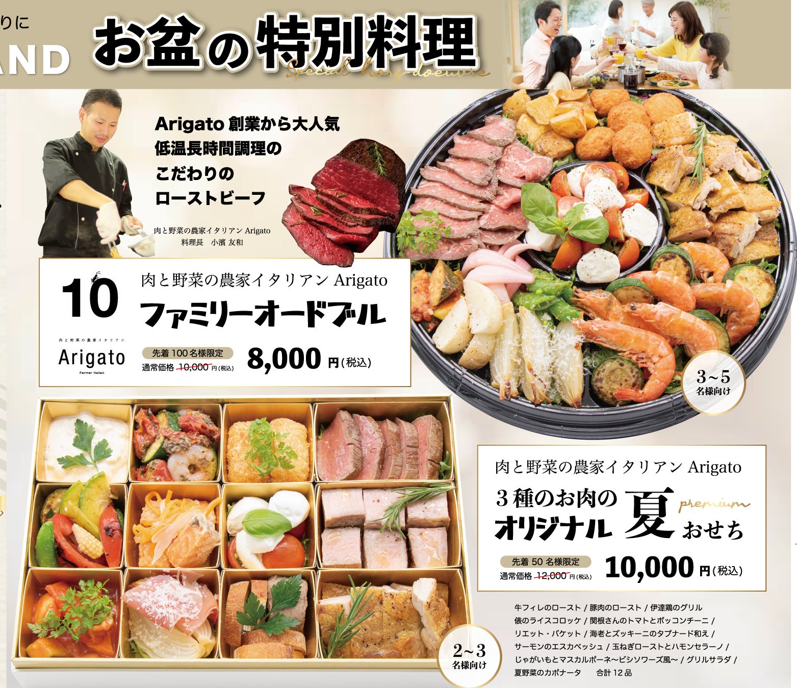 Arigato創業期からご好評いただいている自家製のローストビーフや福島の農家さんこだわりの夏野菜を使用したおせち料理を彩りよくご用意させていただきました。昨年末、年越しのオードブルやおせちが本当に多くのお客様にお喜びいただき、このお盆でも家族の集まりに花を添えられる商品になりました。