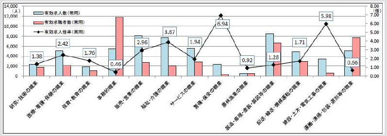 静岡労働局によると、令和5年5月分では全職種の有効求人倍率1.26倍に対し警備・保安の職業は6.94倍と一番