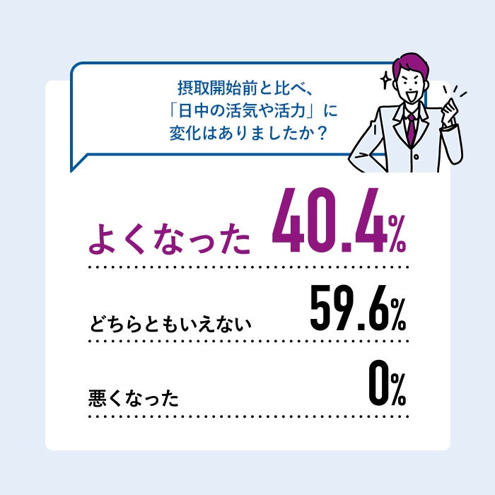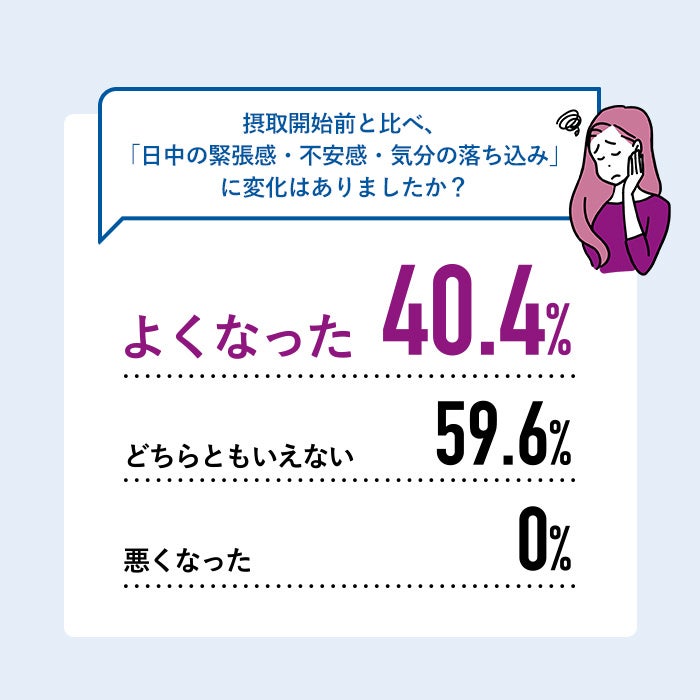 レムウェル摂取前にアンケートを行ったところ、Peach従業員の皆さんの「睡眠の質」に対する満足度は5.3%。74.5%の方が「睡眠の質」に満足していないことがわかりました。レムウェルを約3週間摂取していただいた後、再びアンケートを行ったところ、「睡眠の質」に対する満足度は68.1%という結果になりました。また、「睡眠の質がよくなった」と回答した人が70.2%、「日中の活気や活力の変化」について「よくなった」と回答した人、日中の緊張感・不安感・気分の落ち込みの変化」について「よくなった」と回答した人も40.4%と、ポジティブな変化が多く見られました。
