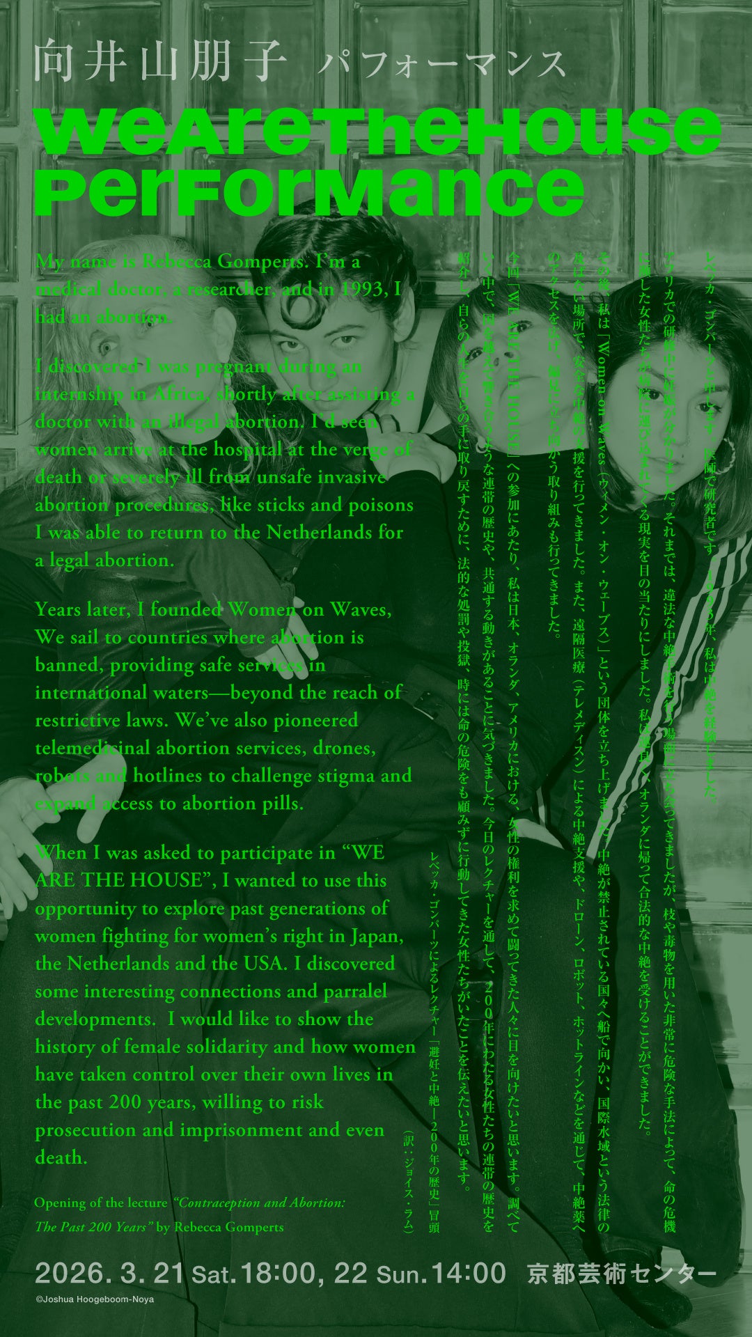 京都芸術センターは、2025年5月に実施した対話型プログラム『向井山朋子 WE ARE THE HOUSE:サロン』での議論と協働を土台に、身体の自己決定権をめぐる問いをさらに掘り下げた向井山朋子の新作パフォーマンスを2026年3月に世界初演します。本作『向井山朋子 WE ARE THE HOUSE:パフォーマンス』は、中絶、#MeToo、クィア、家族、家父長制といった現代社会の多層的なテーマを横断し、「私の身体は、私のもの」という根源的な問いを舞台芸術として立ち上げる試みです。