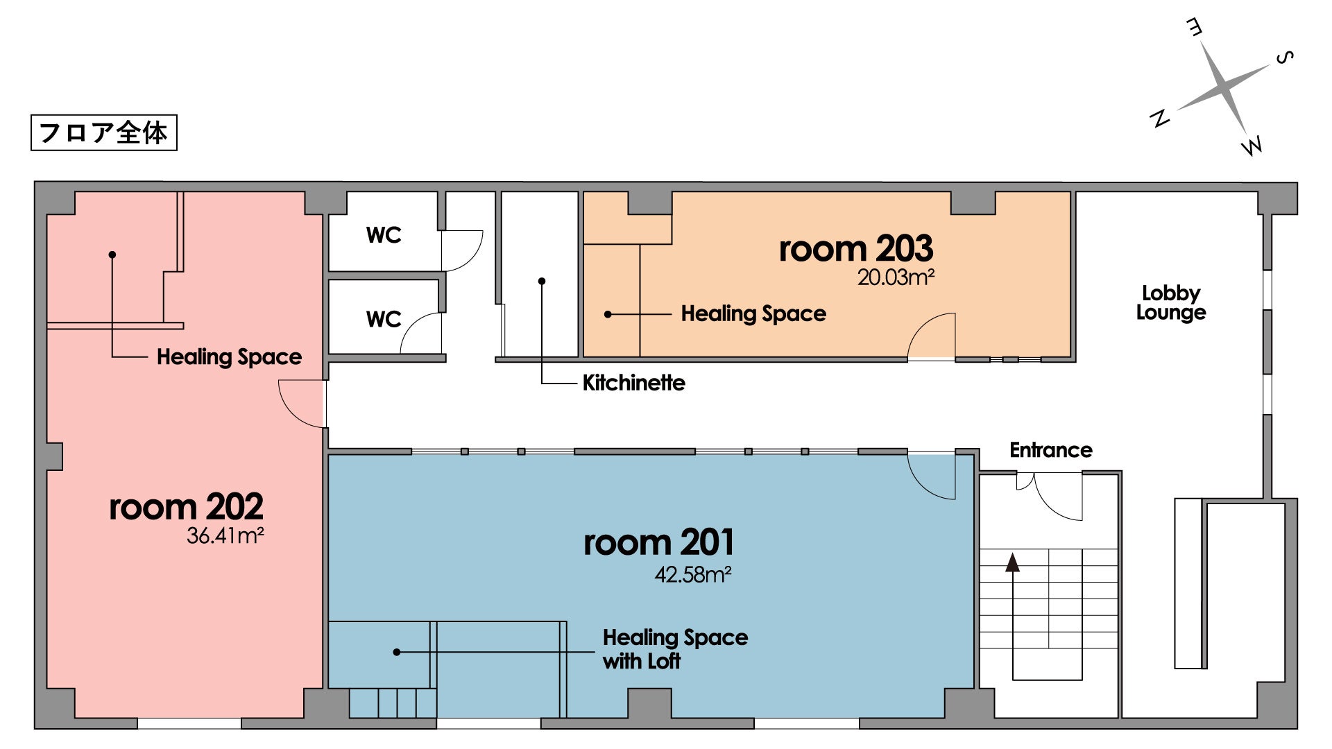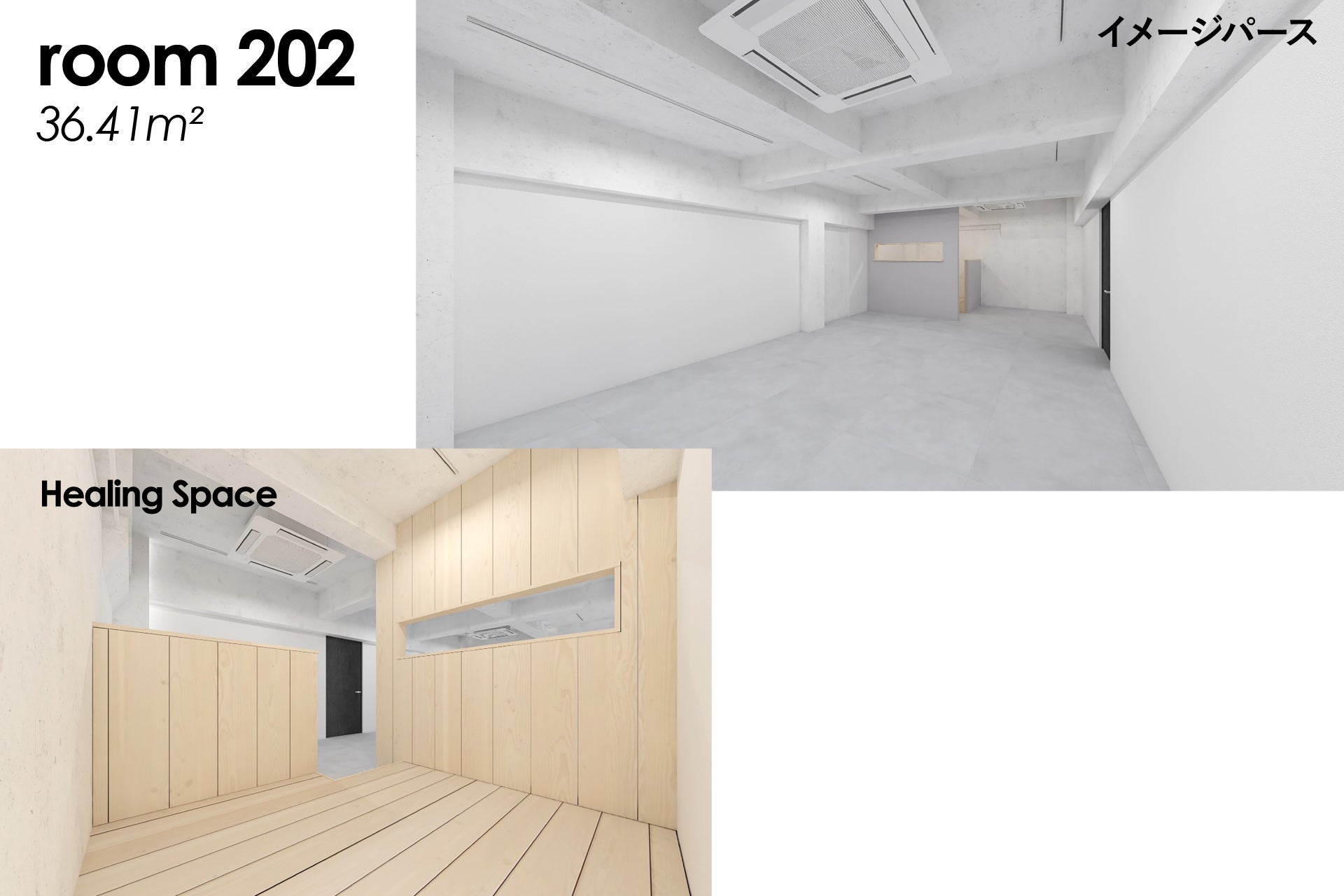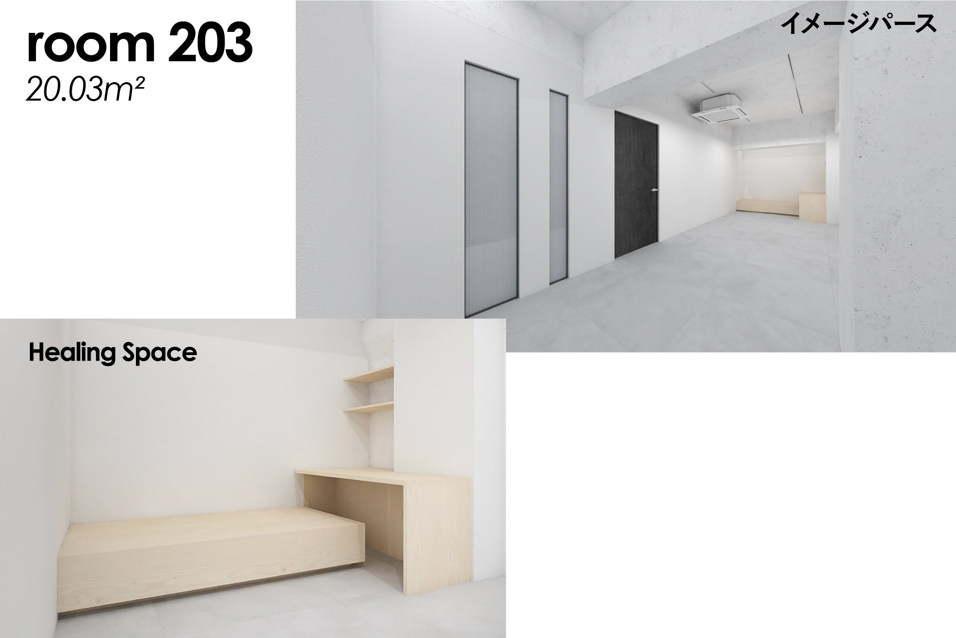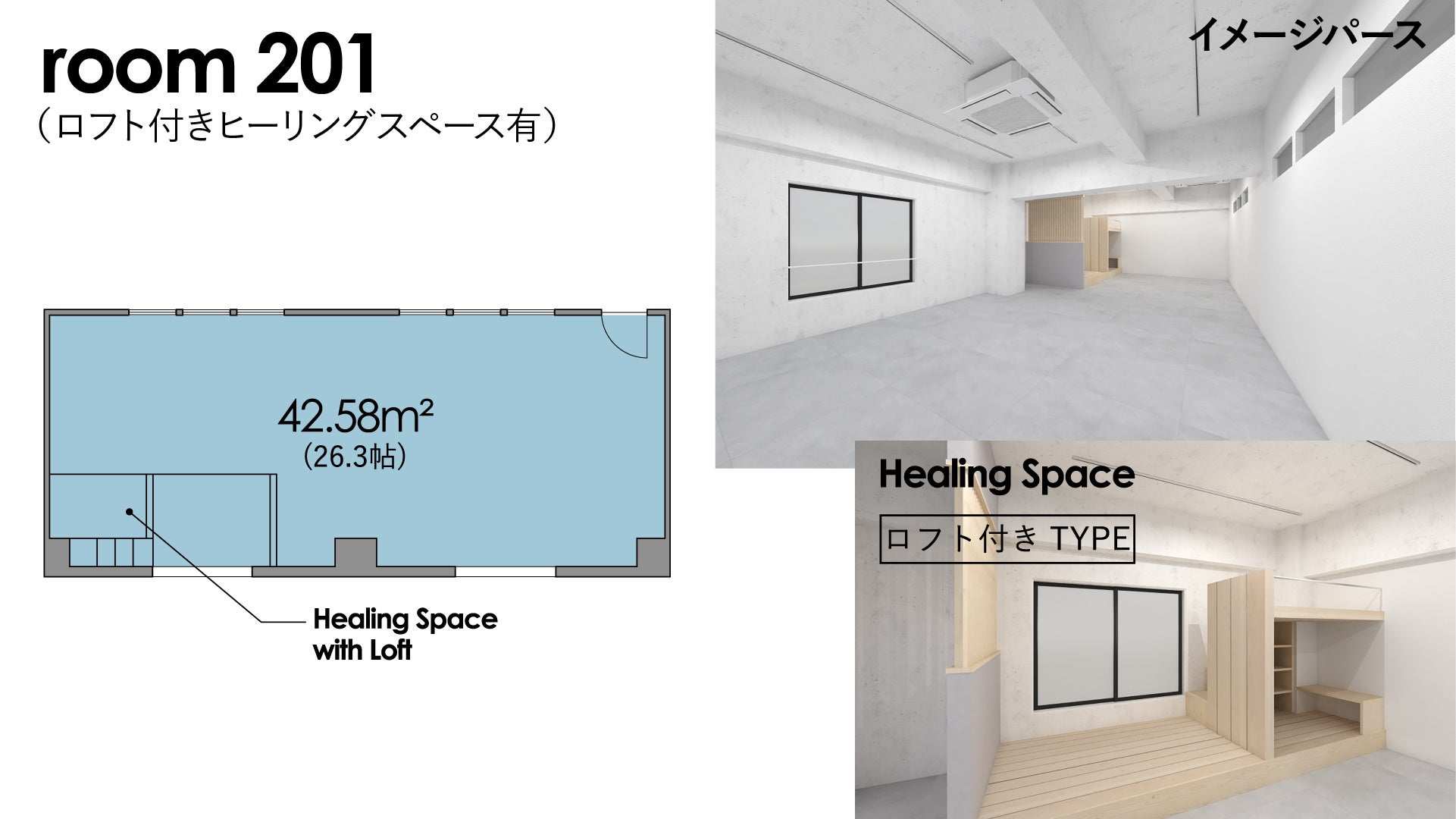 オフィスは「仕事」をするためだけの場所でなくてもいい。rooms higaの各部屋には木のぬくもりを感じるヒーリングスペースが設けられています。仕事の合間にココロとカラダを整える。オフィスの中に癒しの空間があることで、毎日の仕事が、より豊かに、よりクリエイティブになると考えています。ヒーリングスペースの使い方は自由。オリジナリティ溢れる発想で自分たちだけの空間を演出してください。