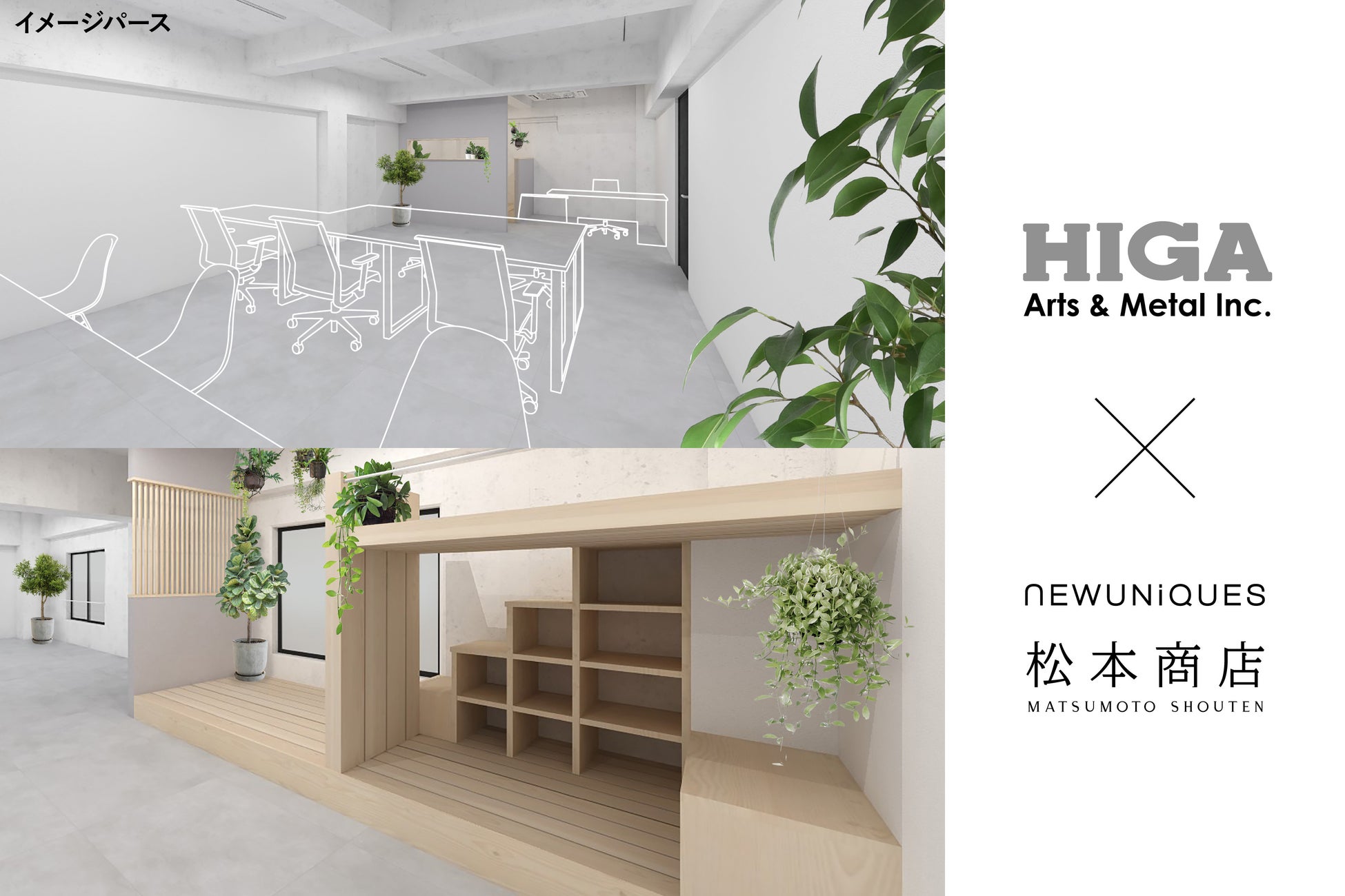 rooms higaは「ヒガ・アーツ&メタル株式会社」のアーツ部門がプロデュースする新しいコンセプトのデザイナーズ賃貸オフィス。これまでアトリエや倉庫として使用していた本社ビル2階フロアを、オフィスとしてリノベーション。ムービー撮影やスチール撮影に使用されているスタジオに隣接しています。設計・施工を担当したのは、クリエイティブなリノベーションで注目されている株式会社ニューユニークスの新ブランド「松本商店」。2023年9月、ヒガ・アーツ&メタルと松本商店のコラボレーションにより、今までにない新しいコンセプトのオフィスが完成します。