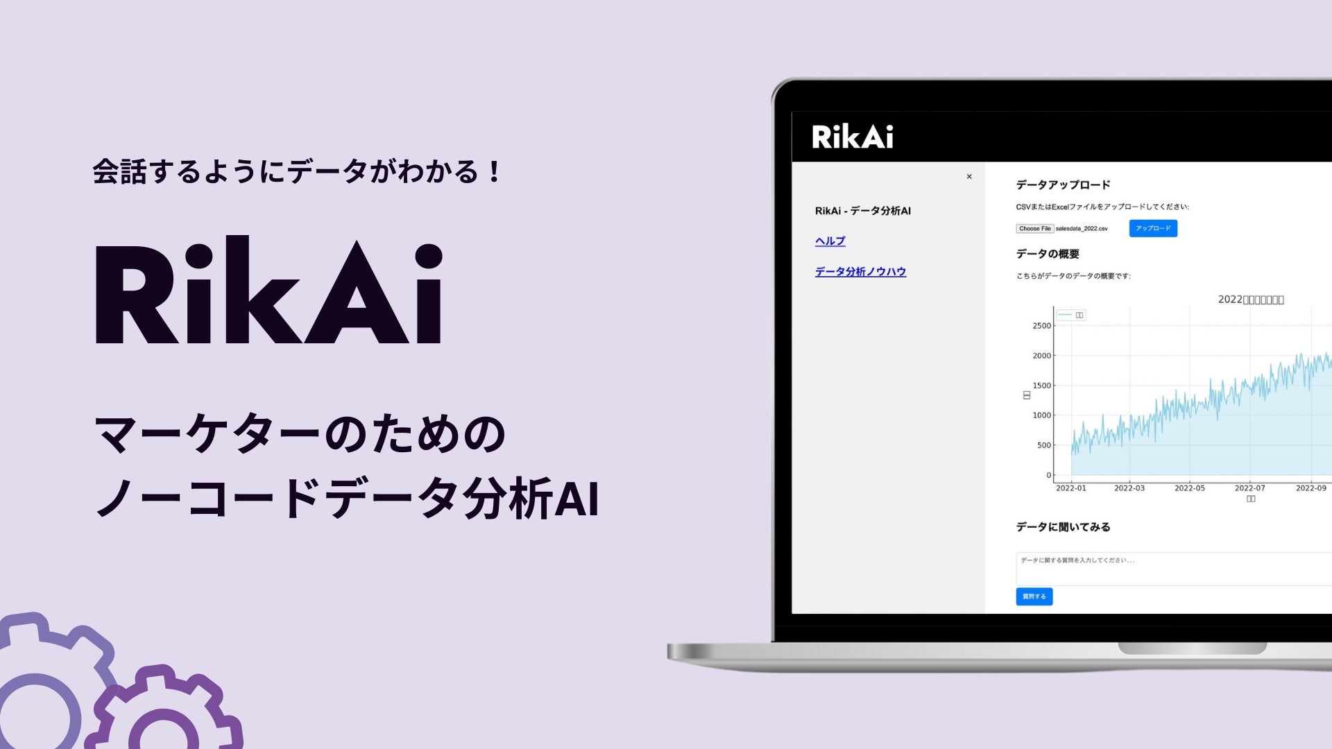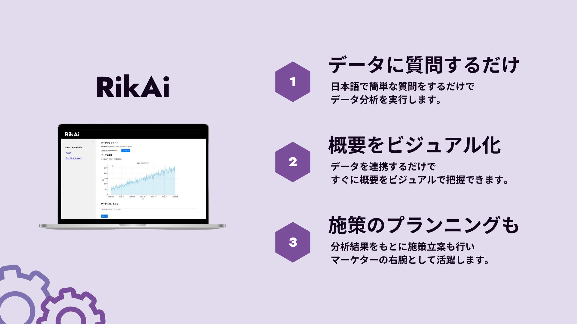 RikAiは簡単な質問をするだけで、エンジニアに頼ることなくデータ分析を行うことが出来る、マーケターのための分析AIサービスです。
