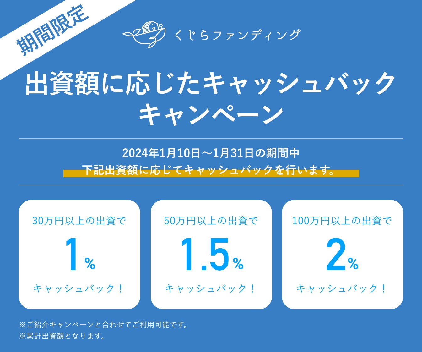 日頃のご愛顧に感謝し、期間中の出資額に応じて、最大2%の特別なキャッシュバックでお返し。2024年1月10日販売開始のくじら5号が対象!