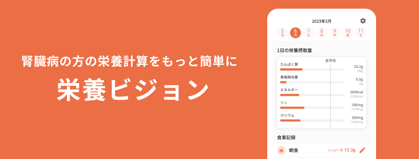 栄養ビジョンは、腎臓病の方に特化した栄養計算アプリ(iOS、Android)です。食事の際に腎臓病に特化した栄養素を記録でき、履歴機能や料理登録機能によって栄養計算にかかる時間を短くすることができます。