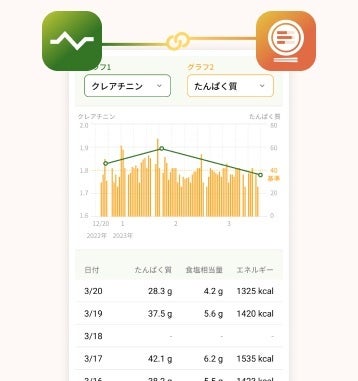 2.弊社が開発した血液検査記録アプリ「じんぞうグラフ」※1と連携し、血液検査結果と栄養摂取量の比較ができます