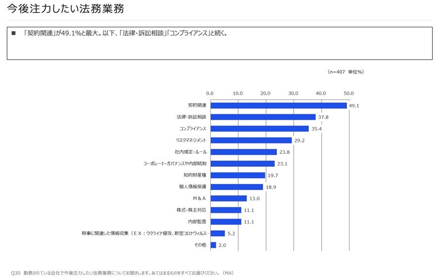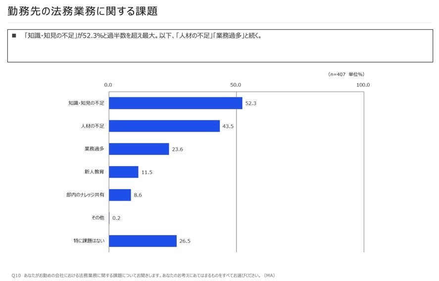 「勤務先の法務業務」に関する課題(複数回答)については、「知識・知見の不足」が52.3%と最多。以下は「人材の不足」(43.5%)▽「業務過多」(23.6%)−などと続きました。