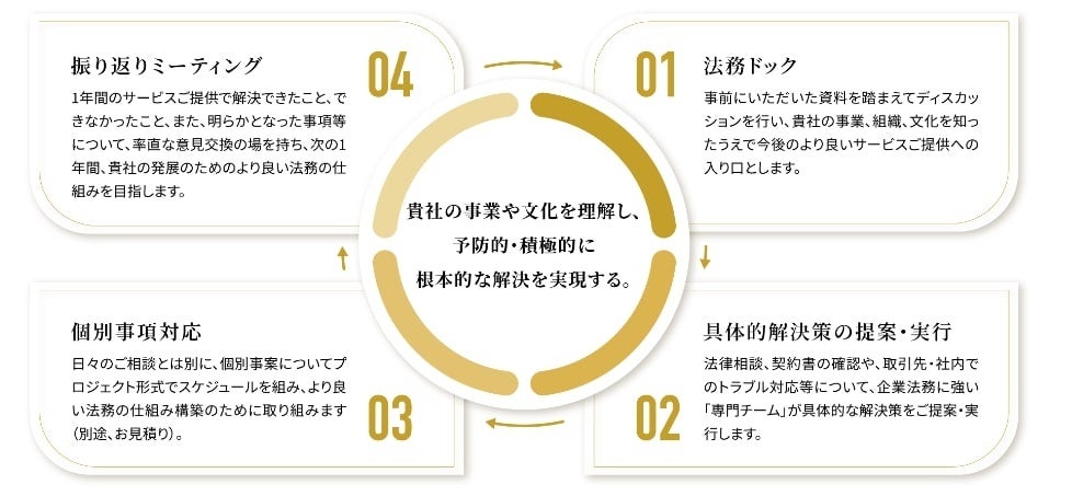 「法務ドック」での議論を踏まえ、就業規則改定や債権回収ルール作成など、法務の仕組み自体を改善していく必要がある場合は、個別にスケジュールを組んでプロジェクト形式で取り組みます(別途費用が必要※5)。