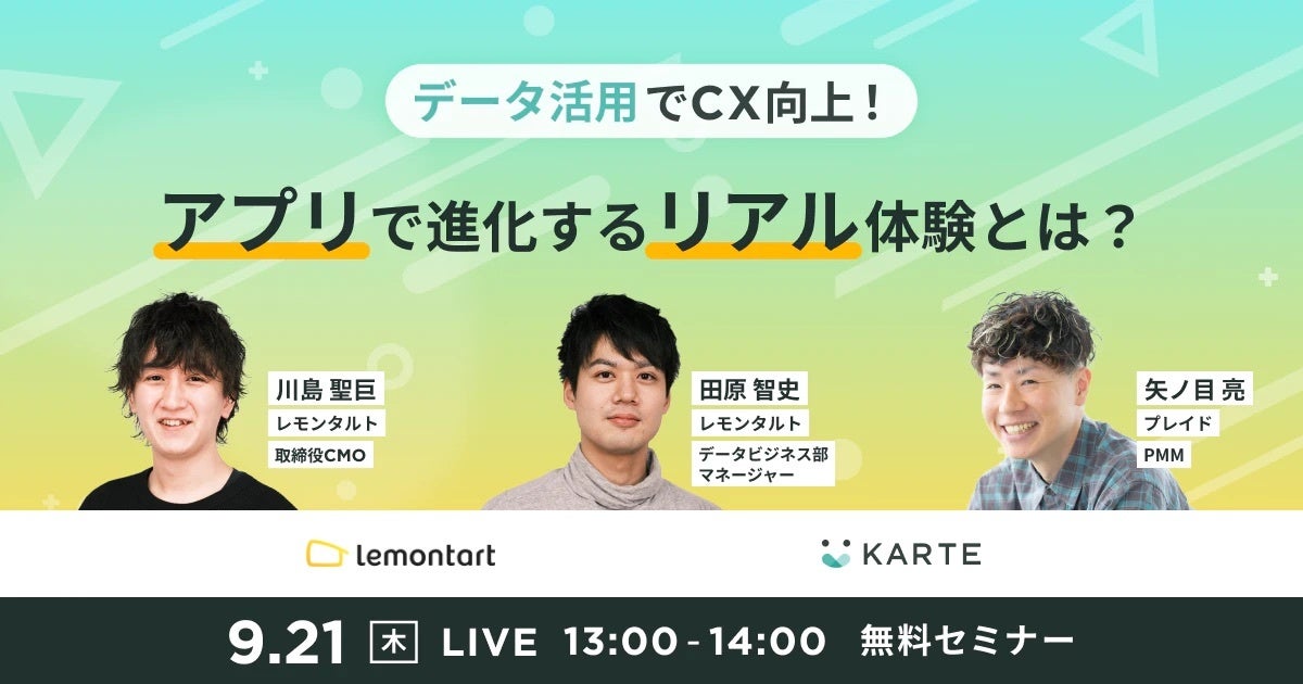 本セミナーでは、ユーザー調査分析〜戦略設計〜アプリ開発運用まで一気通貫型DX支援に強みを持った株式会社レモンタルト、カスタマージャーニーに沿った体験をワンストップで実現できるCXプラットフォームKARTEを提供する株式会社プレイドそれぞれより、「どのように集めたデータをリアルの体験改善に活かすのか?」「どのようにCX改善をビジネス成果につなげるのか?」の観点から、データを活用した体験設計のポイントを解説します。