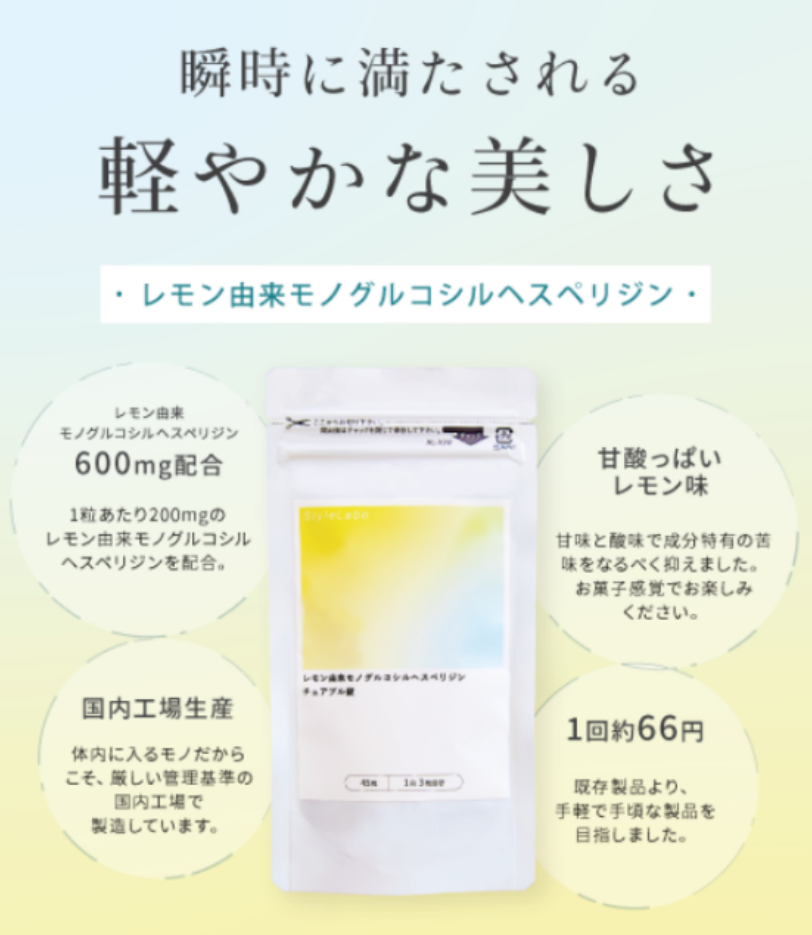 Style Laboから新商品、噛んで食べると顔や脚がスッキリするチュアブルタイプのサプリメント「レモン由来モノグルコシルヘスペリジン」がついに発売開始!
