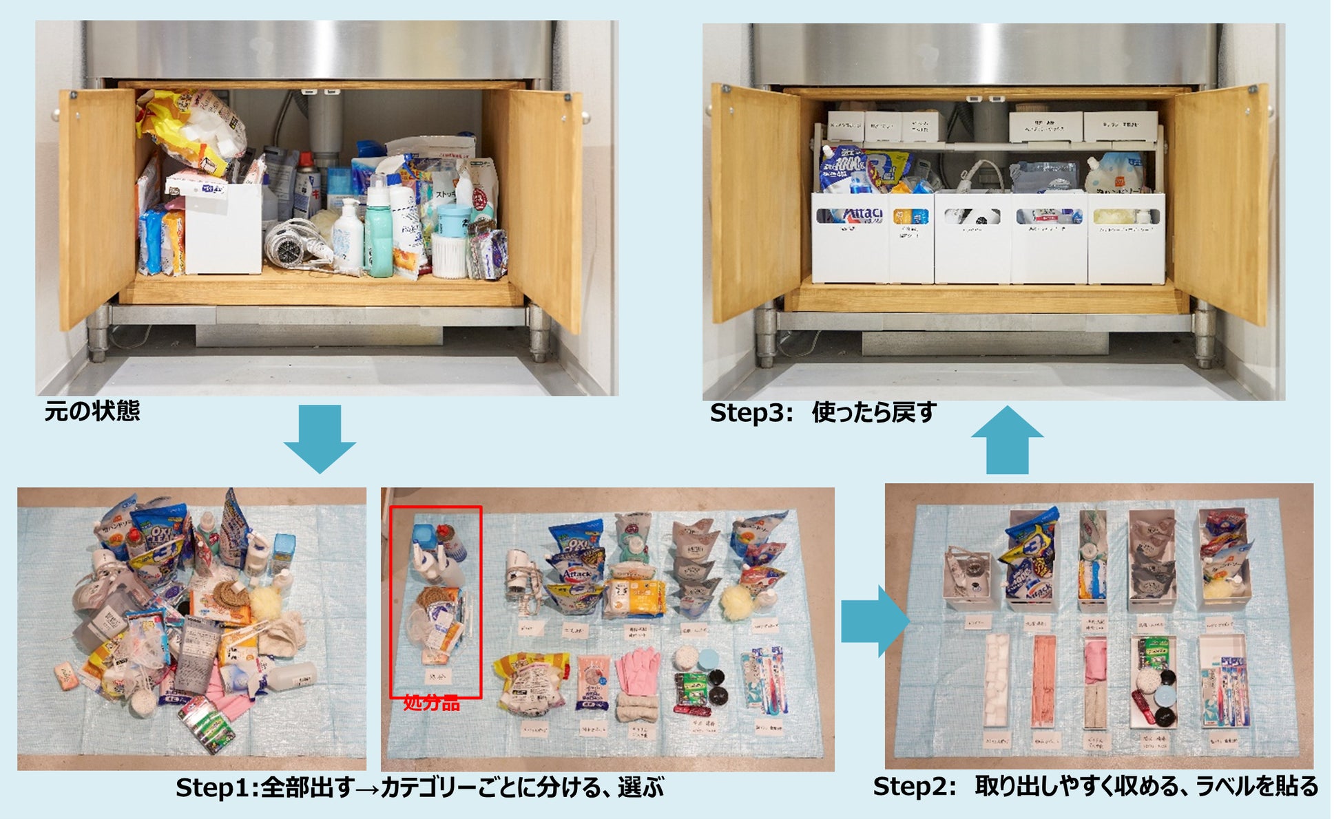 まず大事なことは自分の持つべきモノの適正量を知ることです。そのためには一度引き出しや棚のモノを全て出し、カテゴリーごとに分けていきます。こんなモノを持っていたのかと忘れていたモノが出てきたり、同じモノを沢山買ってストックしていたりという発見があるかもしれません。その後、不要なモノは手放し、使いやすいように収納していきます。最後に、家族の誰もが片づけできるようにラベルをつければ完成です!