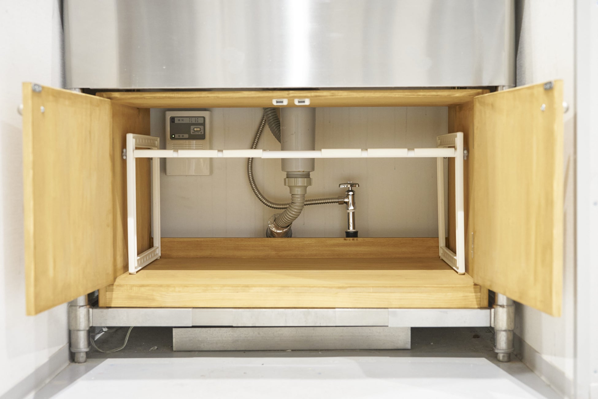 排水ホースを避けて棚が設置できる伸縮タイプのラック。洗面台やキッチンの下はスペースが限られていますので、コの字ラックを使用し上部の空間も有効活用すると片づけが上手くいきます。