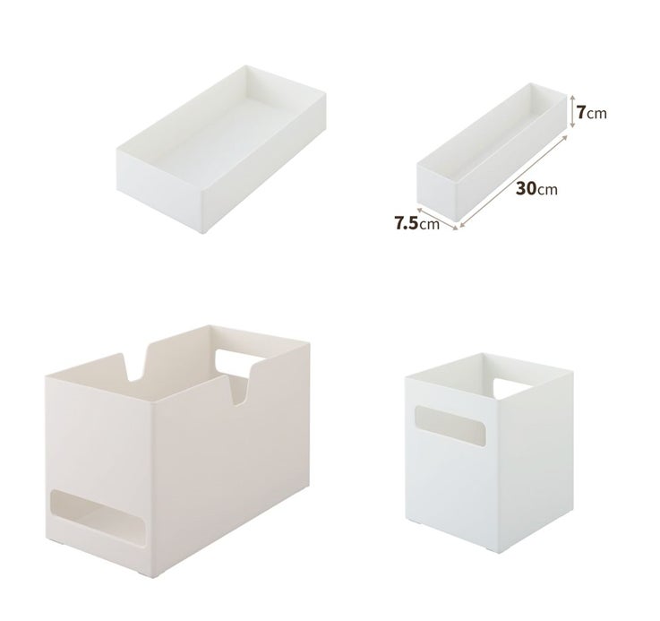 カテゴリーごとに分けたモノを入れるのに便利なアイテムです。サイズ展開されており、収納スペース、収納するモノのサイズに合わせてトレーやケースを選ぶことができます。わかりやすくラベルも貼るのがお勧めです。