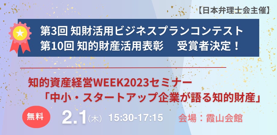 日本弁理士会主催の「第10回知的財産活用表彰」並びに「第3回知財活用ビジネスプランコンテスト」の受賞者が決定しました。2月1日(木)に、受賞者による中小・スタートアップ企業向けセミナーを開催します。