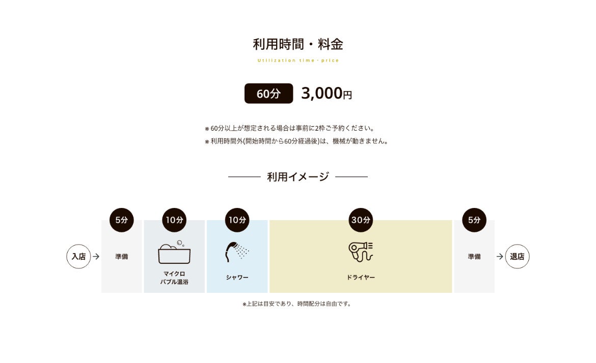 時間内に入浴からドライヤー、帰宅前に簡単な清掃をお願いしており、時間が過ぎると空調、照明以外の機械は制御されます。利用料金は60分3000円。2枠連続して予約することも可能です。