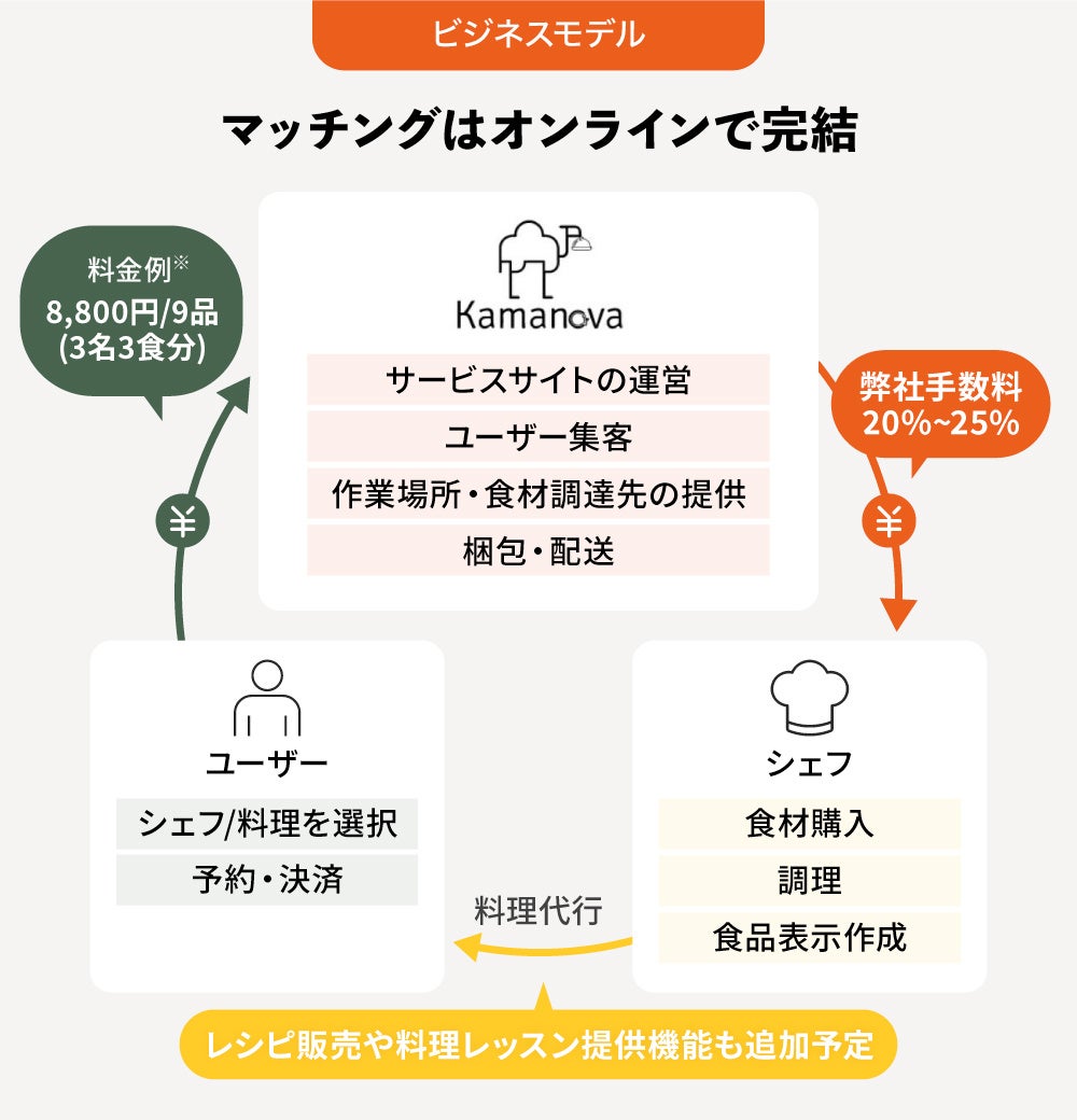 「Kamanova(カマノバ)」は、プロの料理人や経験豊富な栄養士等の料理人と、自宅で高品質な手作り料理を楽しみたいユーザーをマッチングするプラットフォームです。