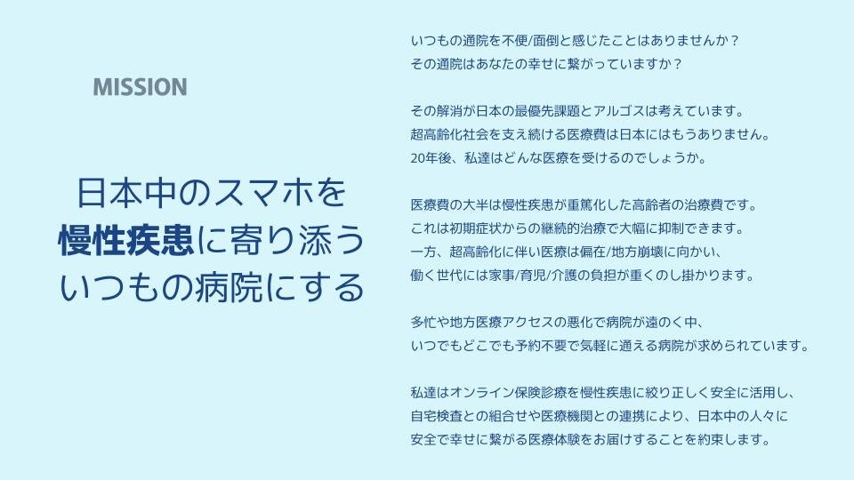 株式会社アルゴスは、慢性疾患を抱える患者様が生活のあらゆる場面で自宅や職場などで継続的な治療を受けられるよう、医療のアクセス格差の解消に貢献していきます。