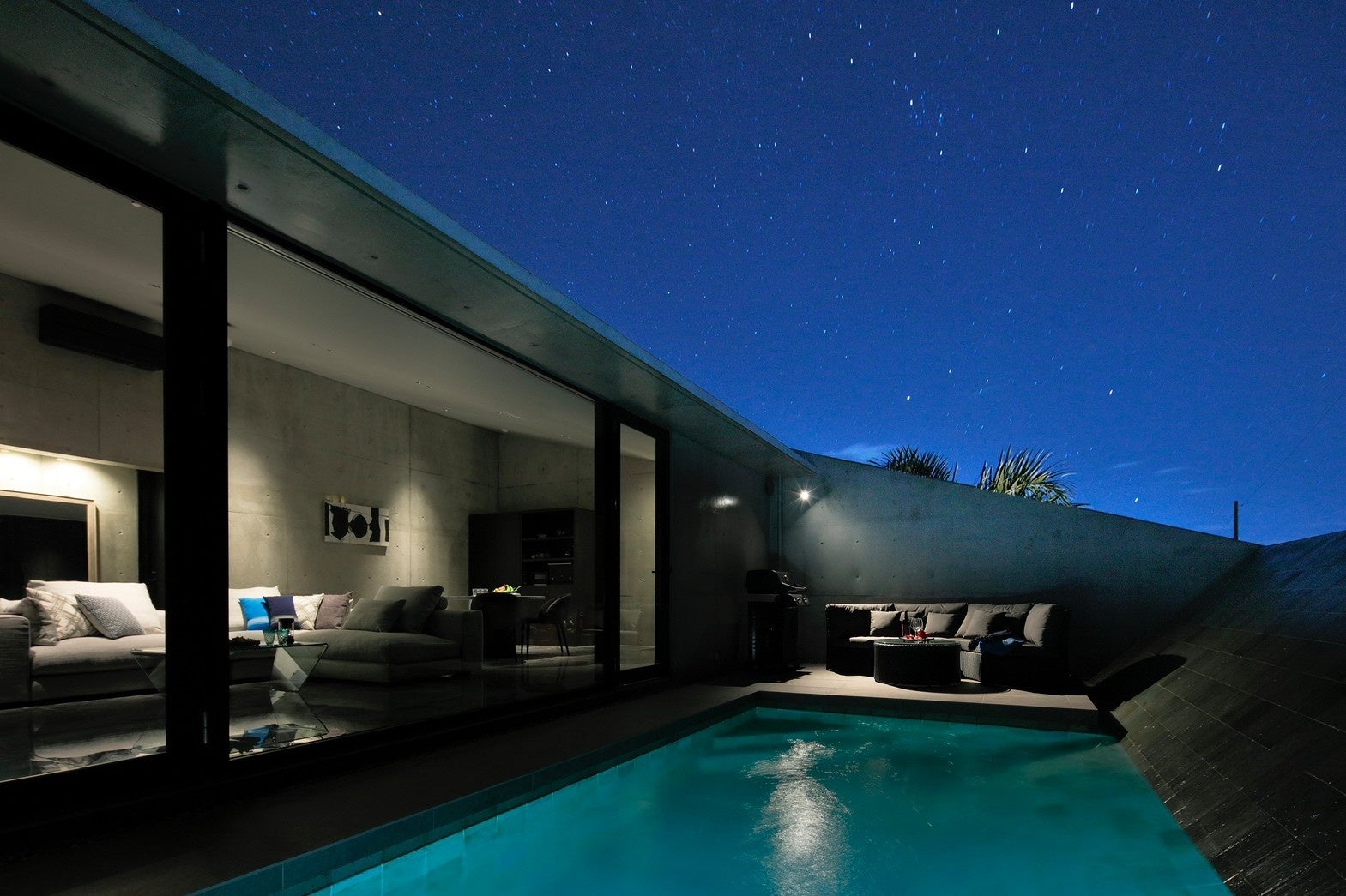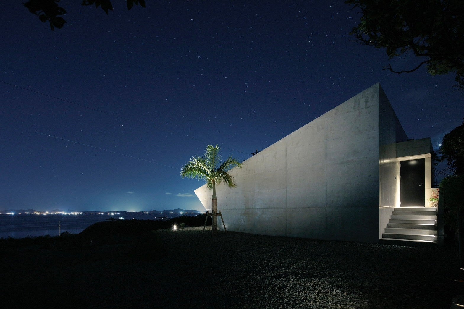 海へとつながる水が流れる斜壁は、外からの視界を遮り、内から海への眺望を確保する事を同時に叶えることができ、宿泊される方に、より特別感を味わっていただけます。