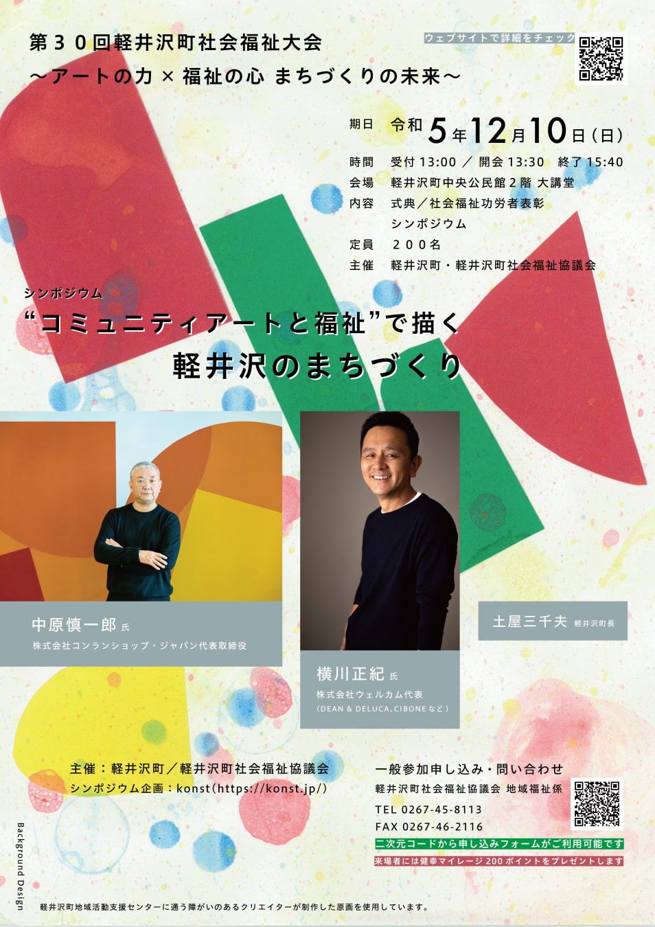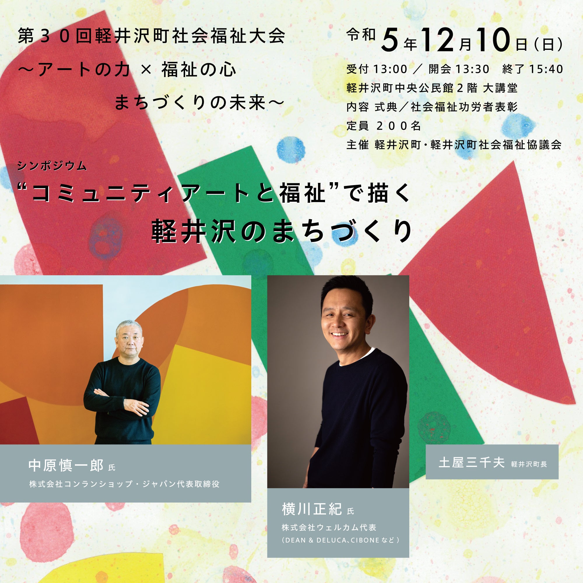<一般参加可能>軽井沢町・軽井沢町社会福祉協議会が第30回軽井沢町社会福祉大会を開催。テーマはアートの力×福祉の心 まちづくりの未来。中原慎一郎氏、横川正紀氏、土屋三千夫軽井沢町長のシンポジウムも。