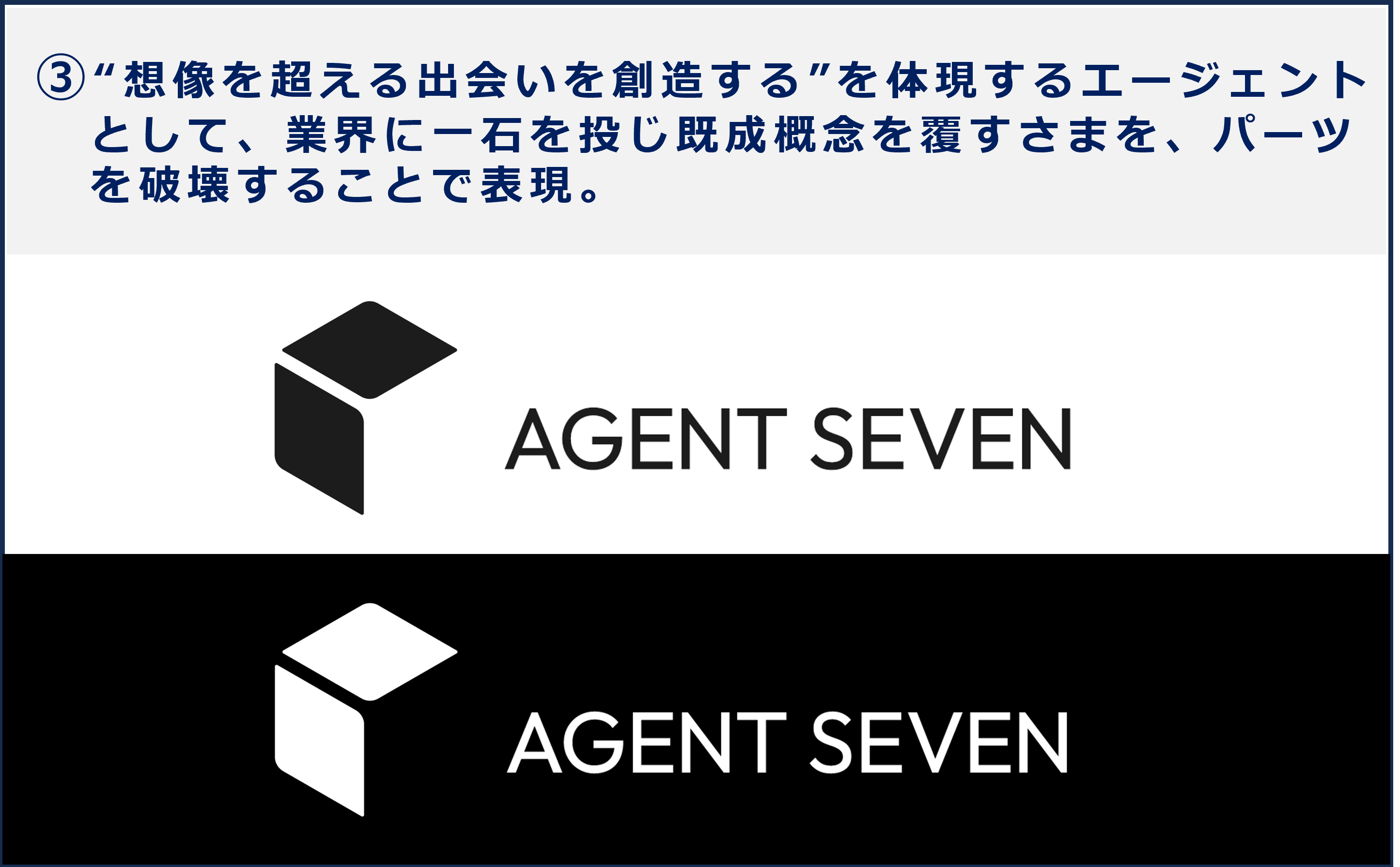 ③そこからさらに、“想像を超える出会いを創造する”を体現するエージェントとして、業界に一石を投じるような新たなサービスの創出を通じて人材紹介の既成概念を壊し、新しい「アタリマエ」をつくっていくさまを体現していきたく、立方体の一部パーツ(=人材業界・転職市場)を取り除いた形での、ロゴの再構築を行いました。