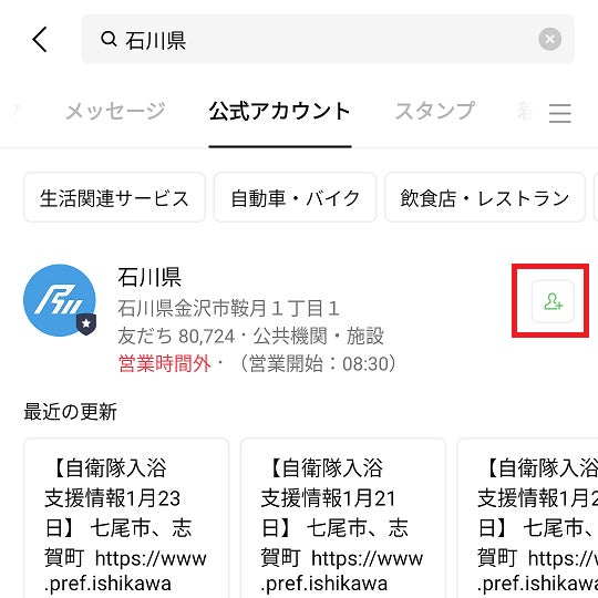 (LINEアプリから、公式アカウントで「石川県」を検索し、友だち登録することも可能です。)