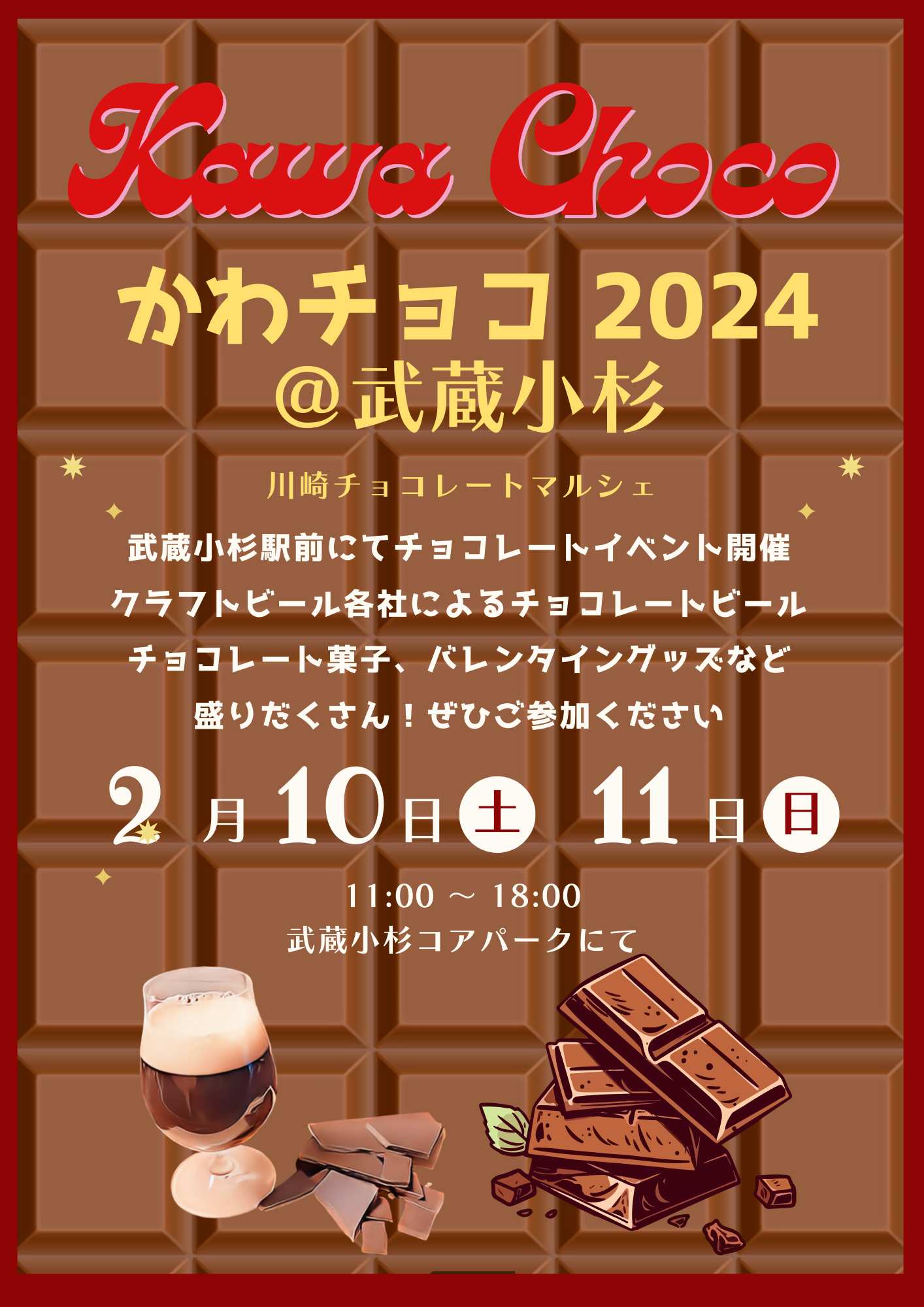 かわチョコ実行委員会(代表:鍵屋醸造所 佐藤学)は、武蔵小杉駅前の武蔵小杉コアパーク(神奈川県川崎市中原区小杉町3丁目1302)にて チョコレートマルシェ「かわチョコ2024@武蔵小杉」を2024年2月10日(土)〜2024年2月11日(日)に開催致します。