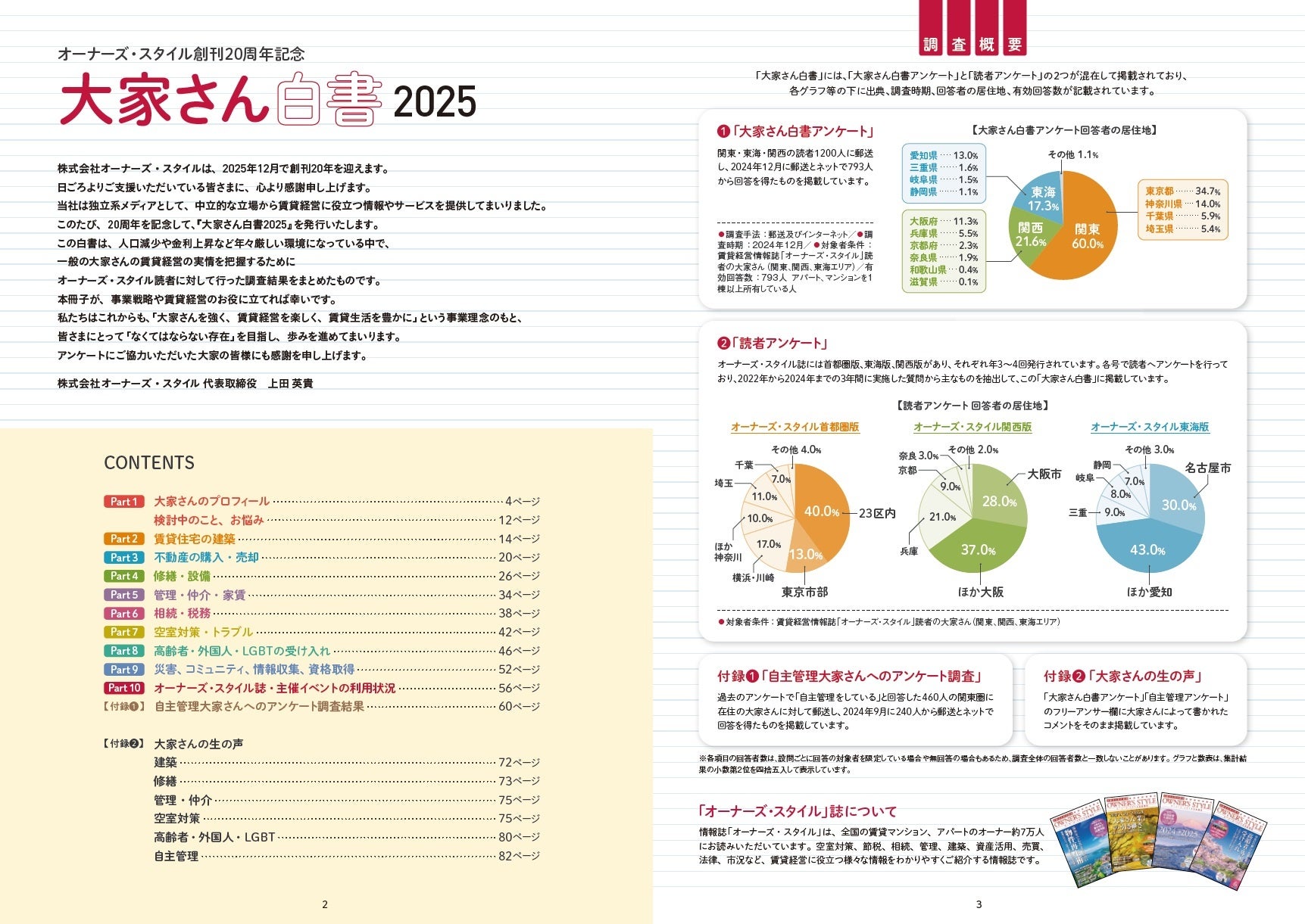 賃貸経営情報誌『オーナーズ・スタイル』(株式会社オーナーズ・スタイル、本社:東京都中央区)は、創刊20周年を記念して、『大家さん白書2025』(A4サイズ・84ページ)を発行いたしました。